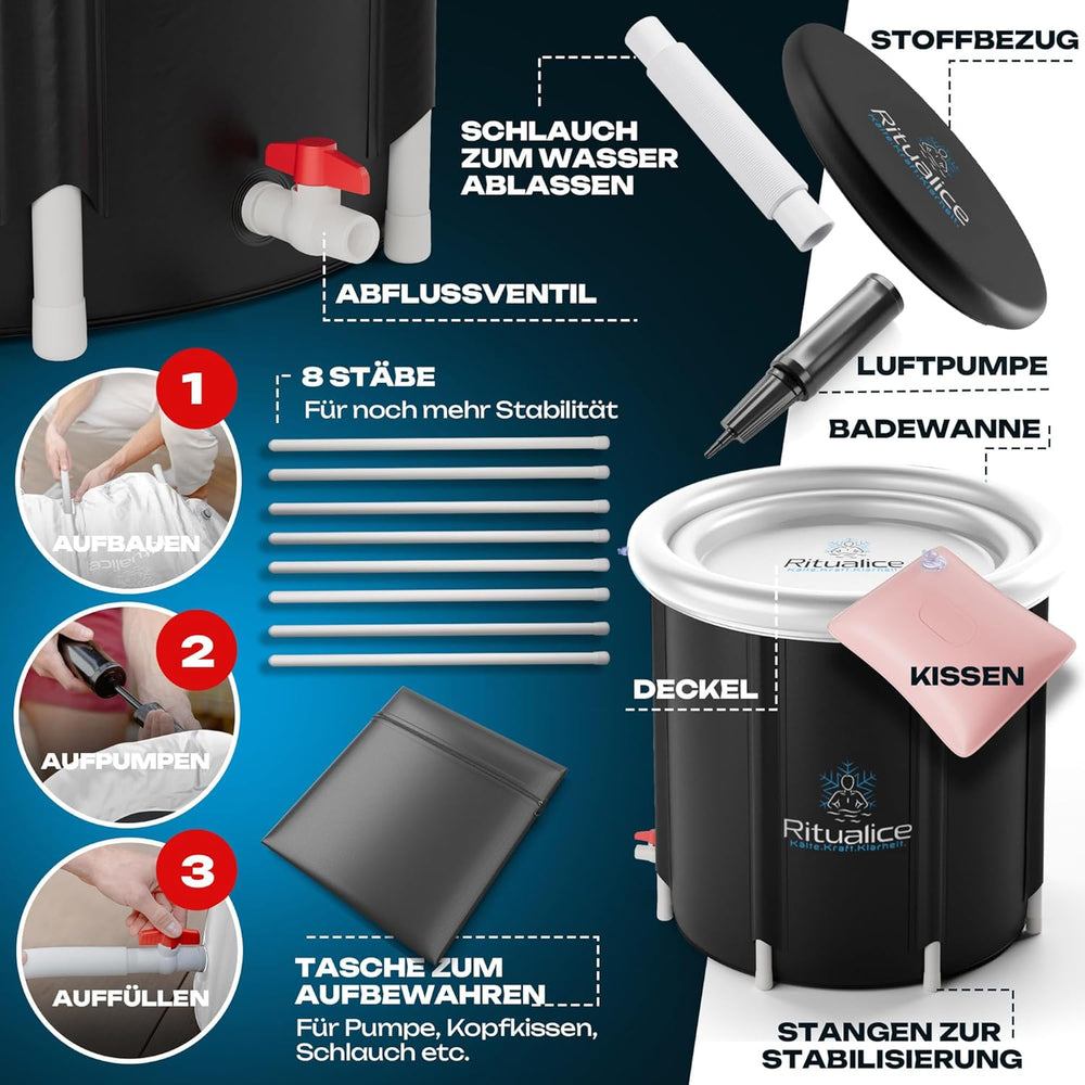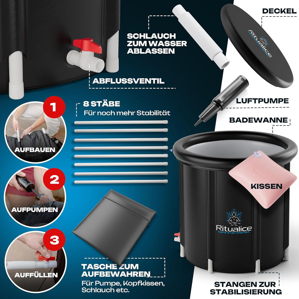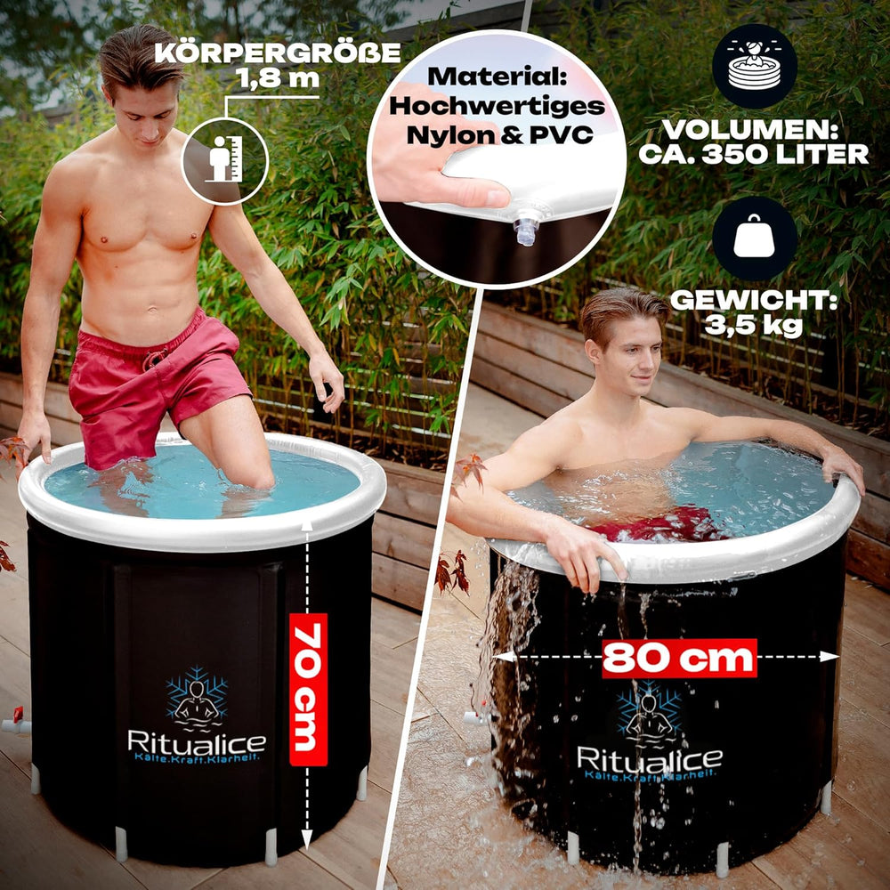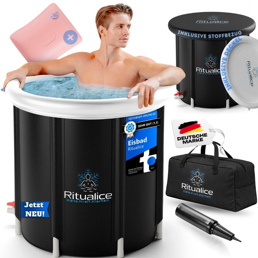Ritualice® Eisbad (80 cm Ø) XL Komplettset - TESTSIEGER - Eistonne Set mit Deckel, Stoffbezug und XL