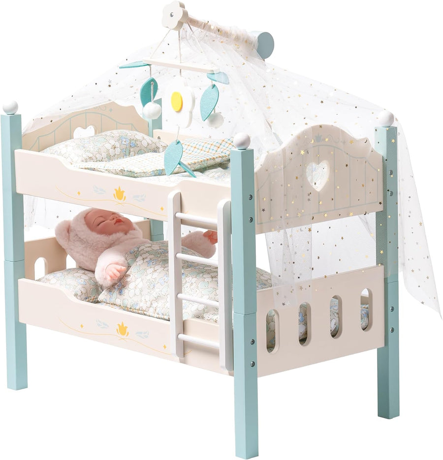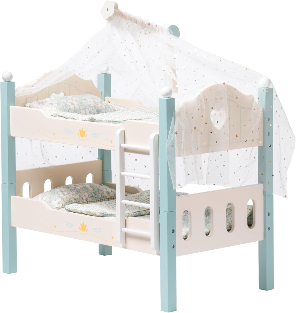 ROBOTIME Puppen-Etagenbett aus Holz, Puppenbetten, umbaubares Bett mit Leiter und Bettzeug, für 18 Z