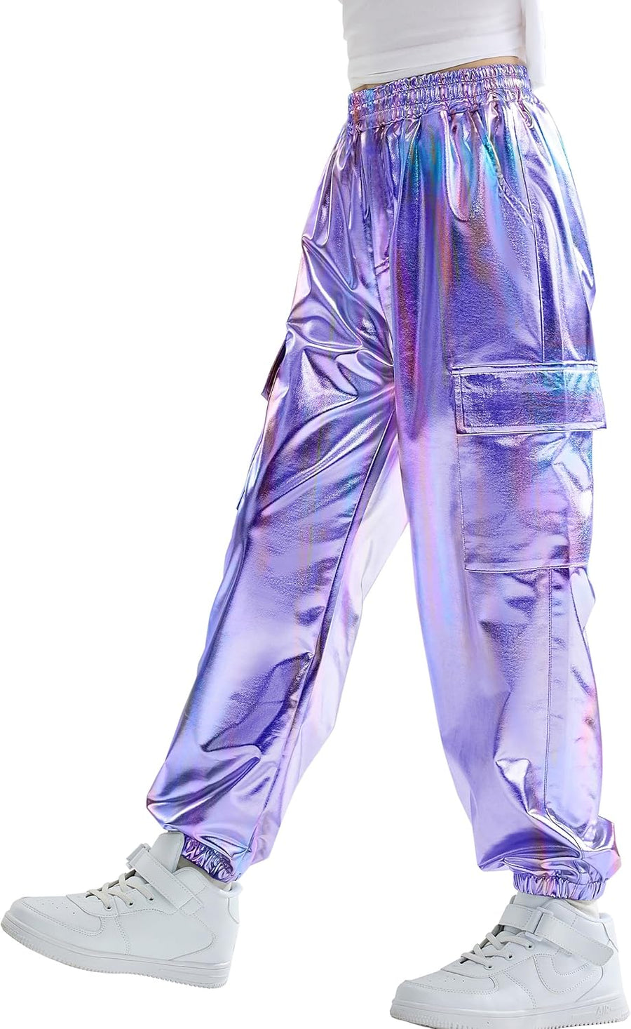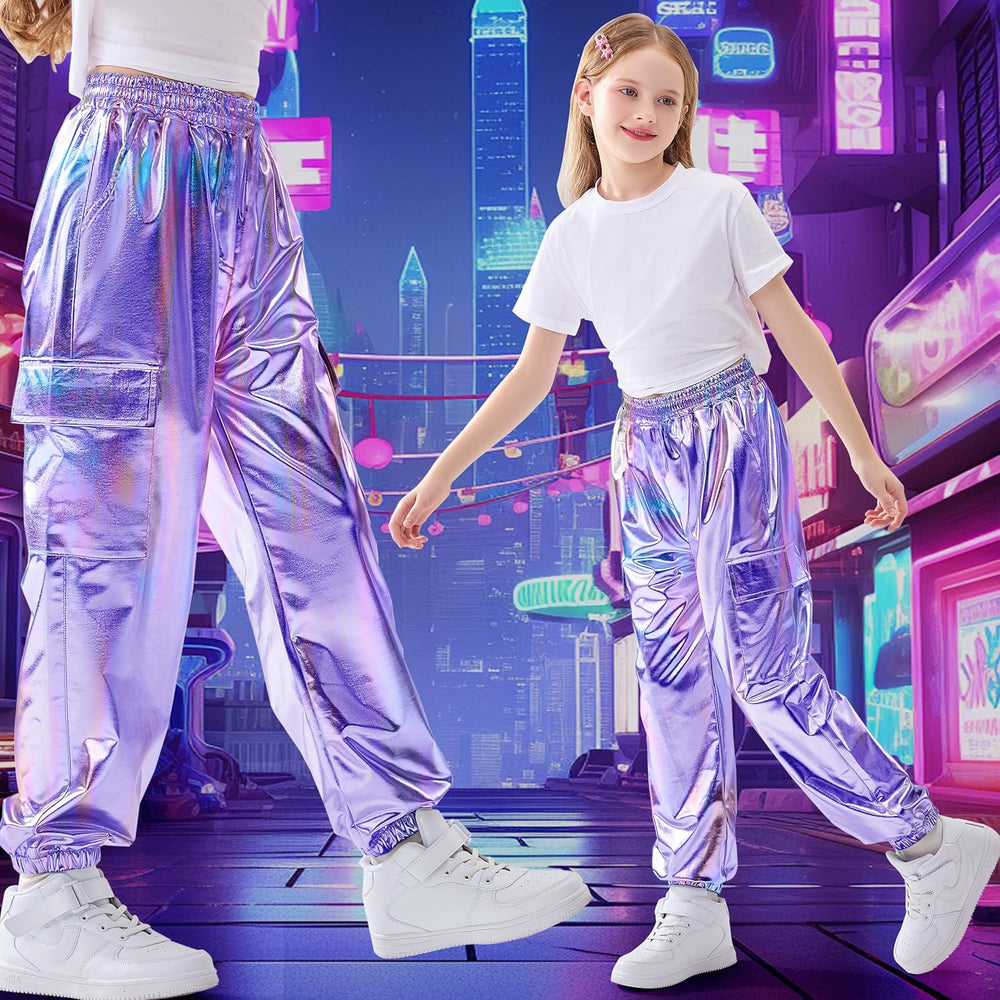Rolanko Cargo Hosen für Mädchen, Metallische Tanz Hip Hop Hosen für Kinder Mit Elastischem Bund, Ret