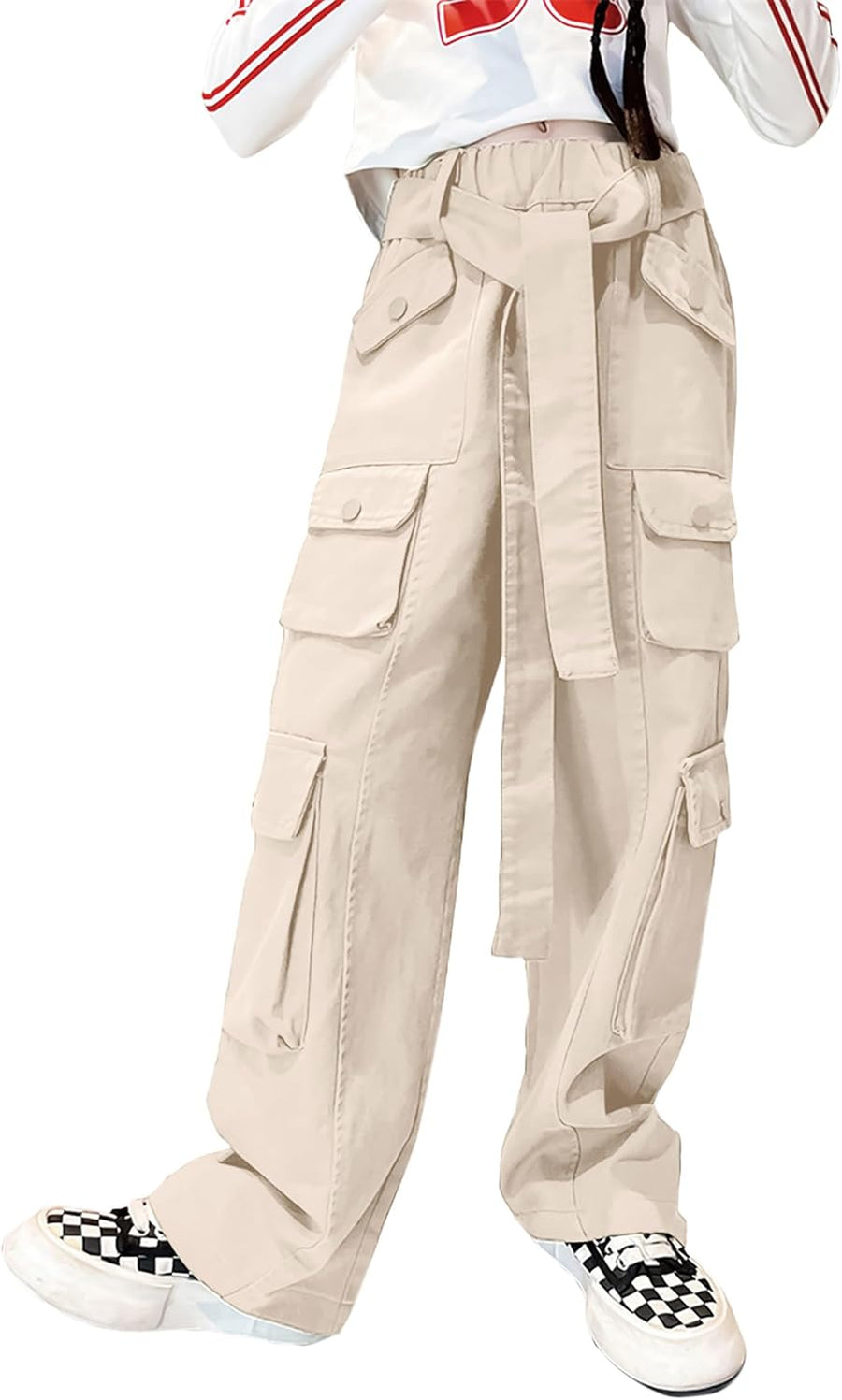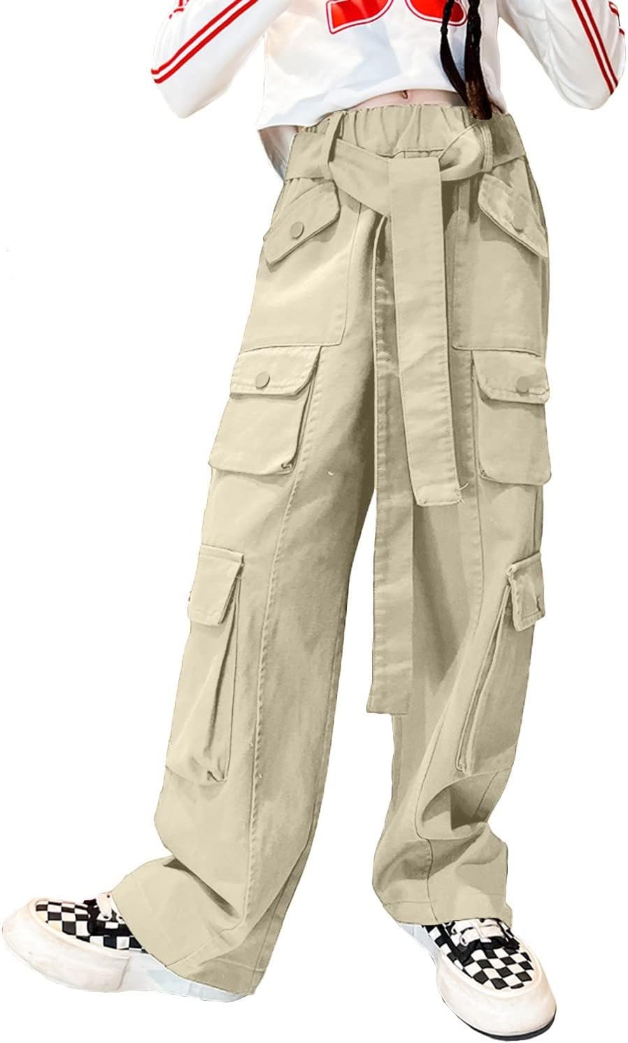 Rolanko Kinder Cargo Hose Elastische Taille Jogger Tanz Hose für Mädchen Streetwear Hip Hop Beige 8-