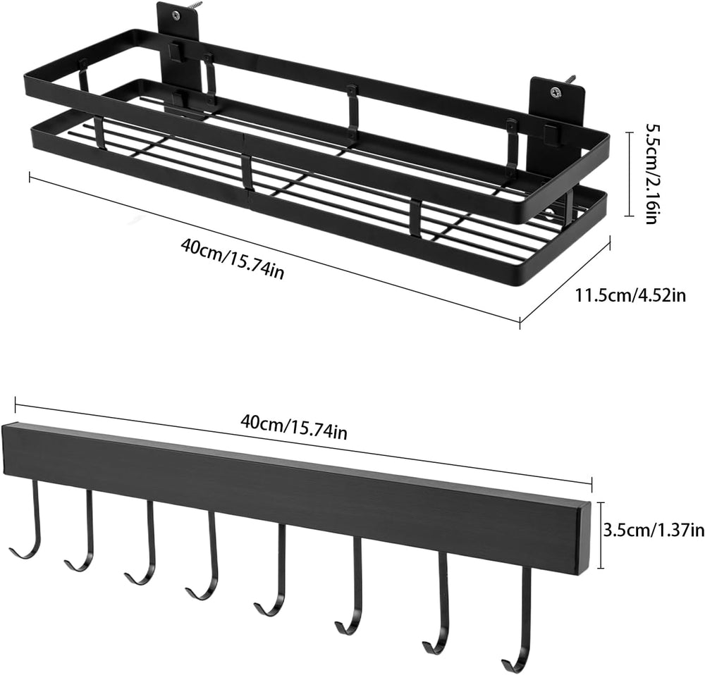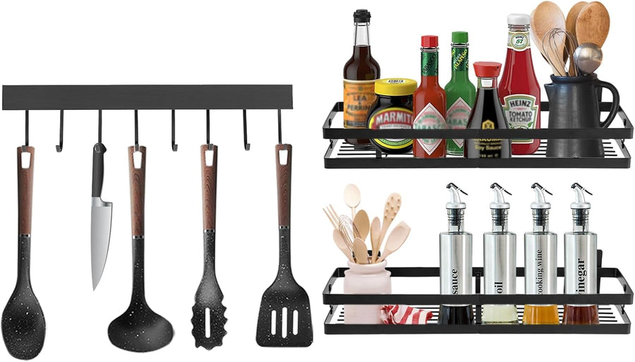 SABUIDDS Gewürzregal Wand aus Metall, Küchenregal Wand mit 2 Stück Schwebendes Regal und 8 Haken, Sp