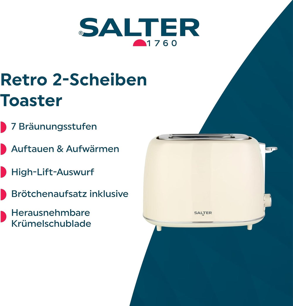 Salter Retro Creme 2-Scheiben-Toaster - 7 Bräunungsstufen, Auftauen, Aufwärmen & Abbrechen, High-Lif