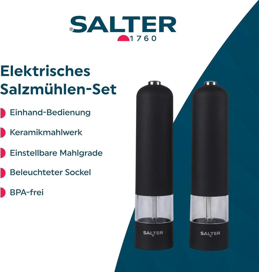 Salter Elektrisches Salz- & Pfeffermühlen-Set – Einhandbedienung, Keramikmahlwerk, einstellbarer Mah