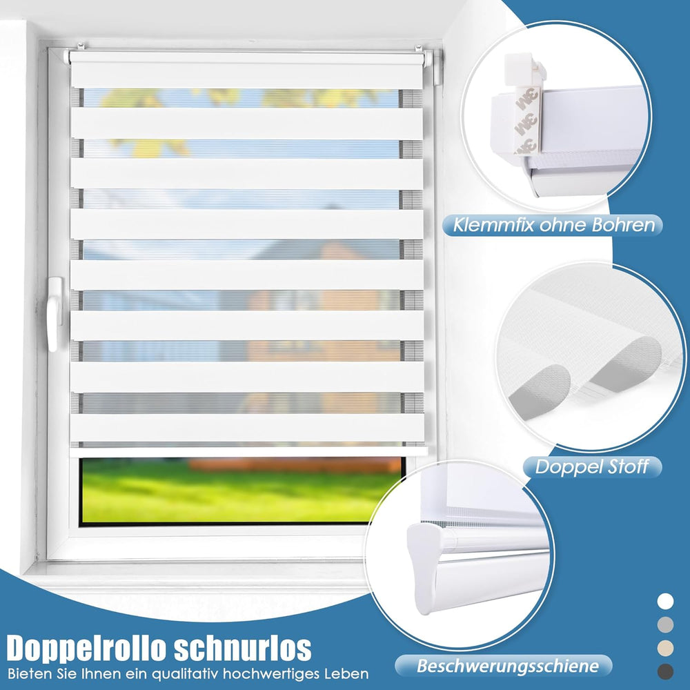 SBARTAR Doppelrollo schnurlos Klemmfix Rollos für Fenster ohne Bohren & zum Bohren, Weiss 100x140cm