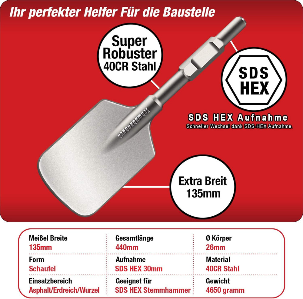SCHWABENBACH ® SDS HEX Meissel 135 x 440mm - Ideal zum Abtragen von Beton & Mauerwerk - SDS Sechskan
