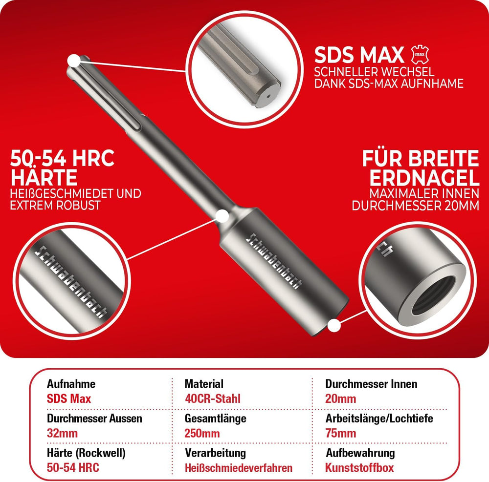SCHWABENBACH ® SDS MAX Erdnageleintreiber zum Einstecken von Tiefenerder 250 x Ø 32 mm, Innen Ø 20 m
