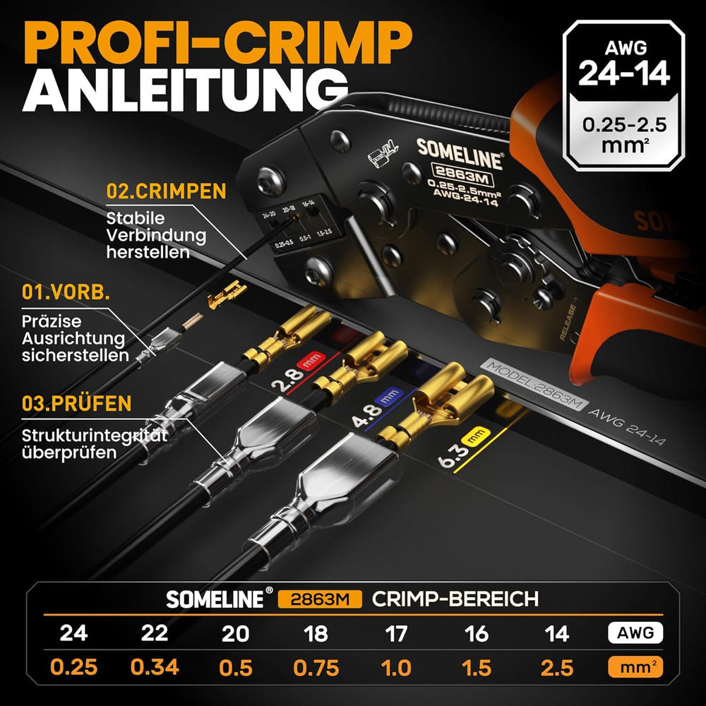 SOMELINE® Crimpzangen Set, 6 Arten [0,25-2,5mm²] Flachsteckhülsen Set, Flachsteckhülsenzange, Spade