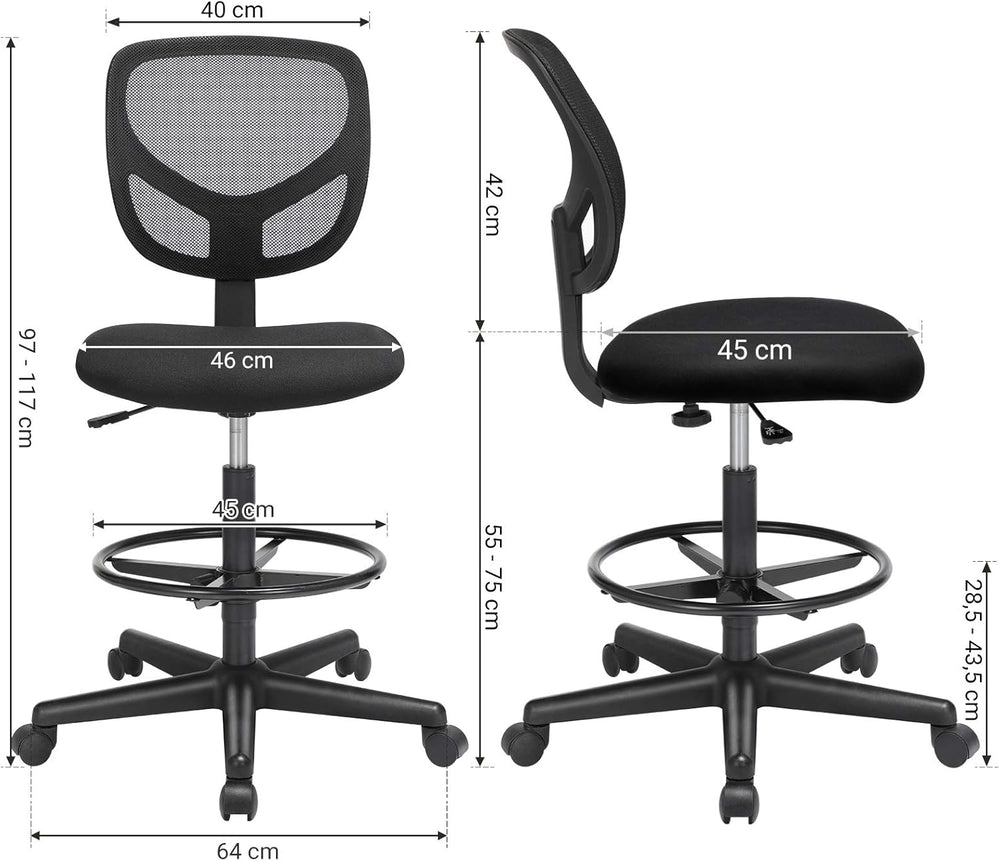 SONGMICS Arbeitsstuhl, Bürostuhl, Sitzhöhe 55-75 cm, hoher Drehstuhl mit Verstellbarer Fussstütze, B
