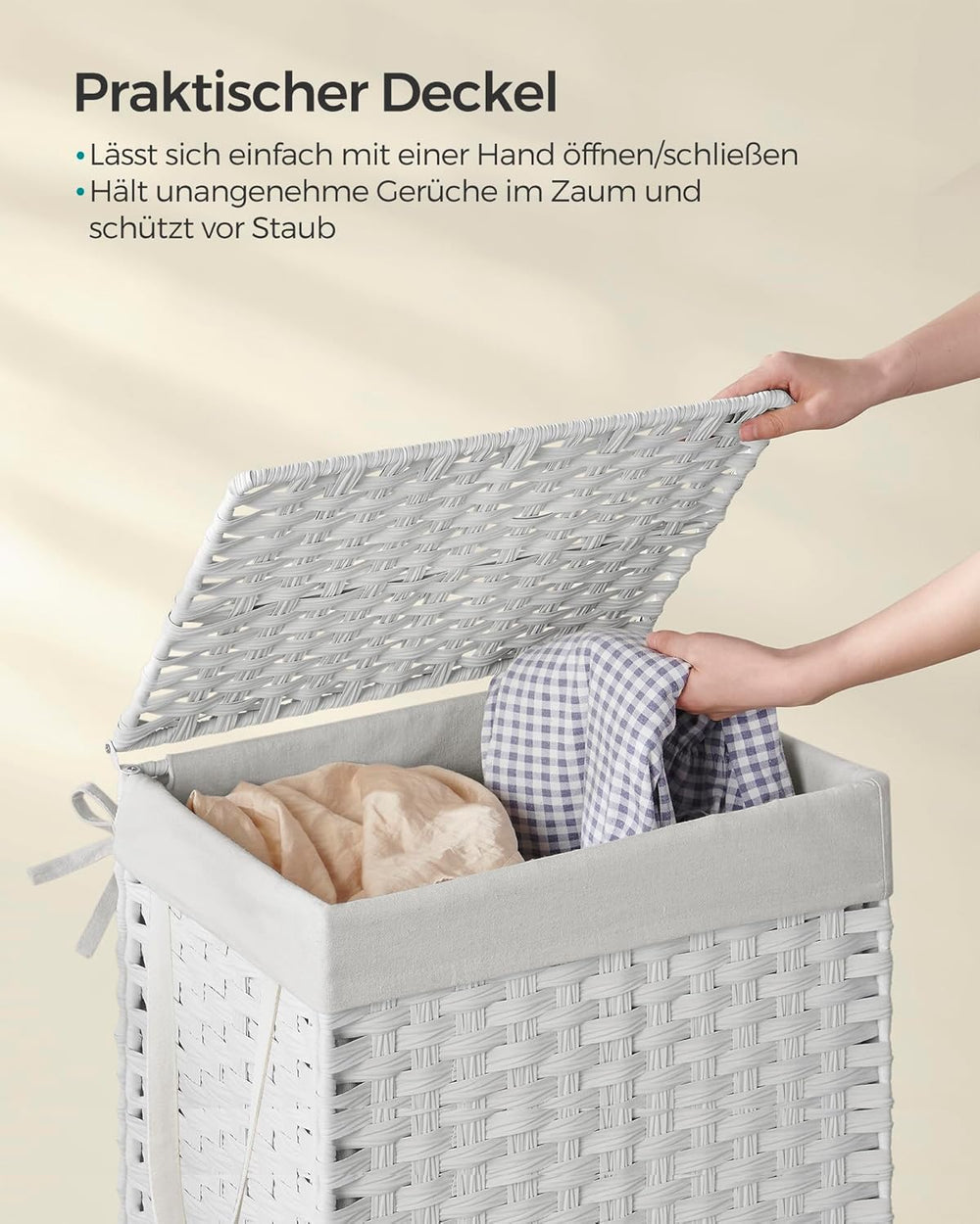 SONGMICS 90L Wäschekorb handgeflochten, mit Deckel und Griffen, Wäschesammler aus synthetischem Ratt
