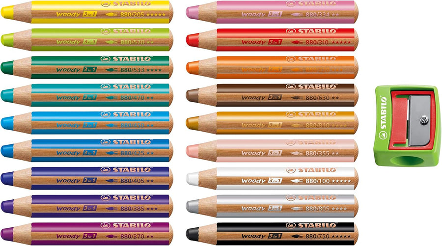 Buntstift, Wasserfarbe & Wachsmalkreide - STABILO woody 3 in 1 - 18er Pack mit Spitzer - mit 18 vers