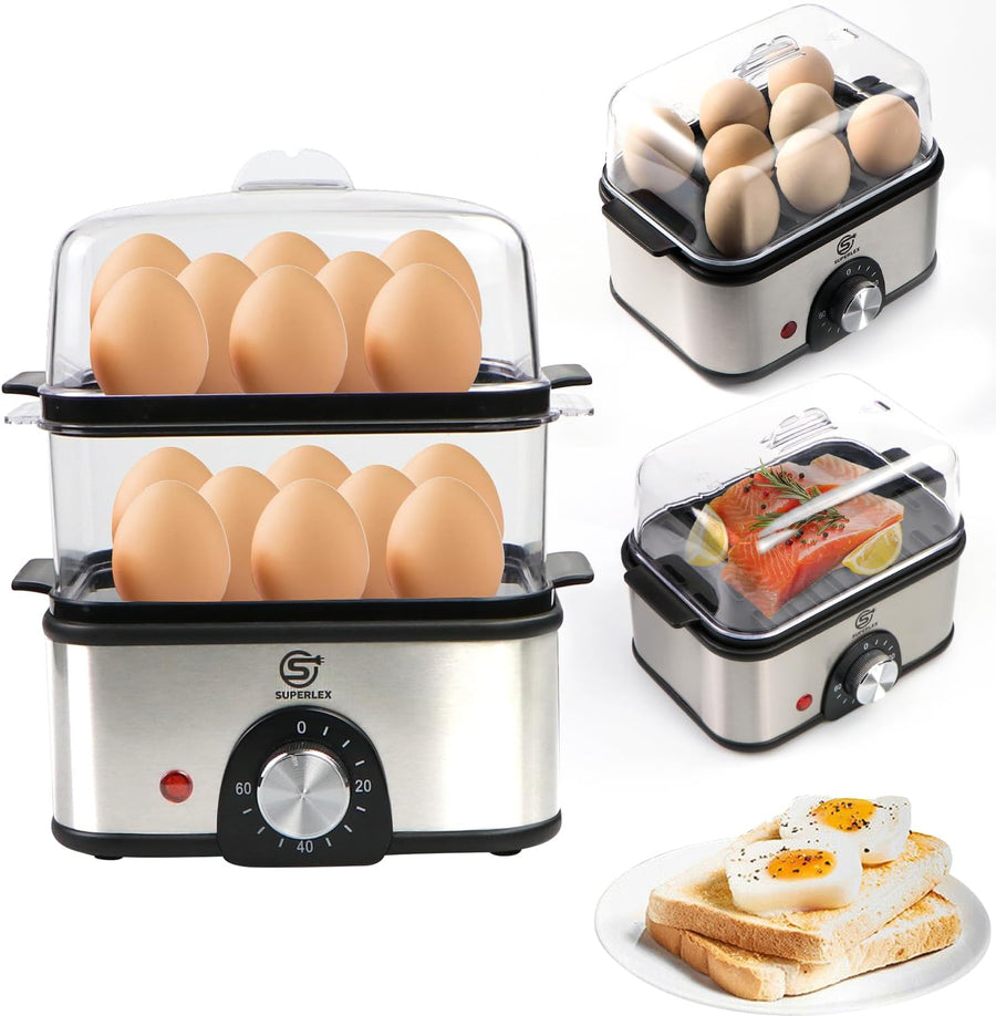 SUPERLEX 2-Schicht Eierkocher Edelstahl für bis zu 16 Eier, elektrischer Dampfgarer, mit Zeiteinstel