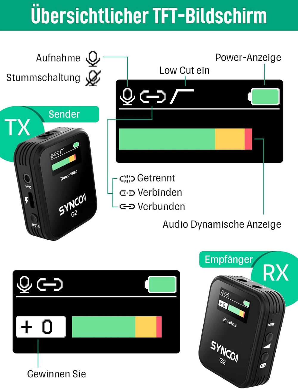 SYNCO G2 A1 2,4GHz Lavalier Mikrofon Wireless mit TFT Bildschirm, Ansteckmikrofon Kabellos bis zu 70