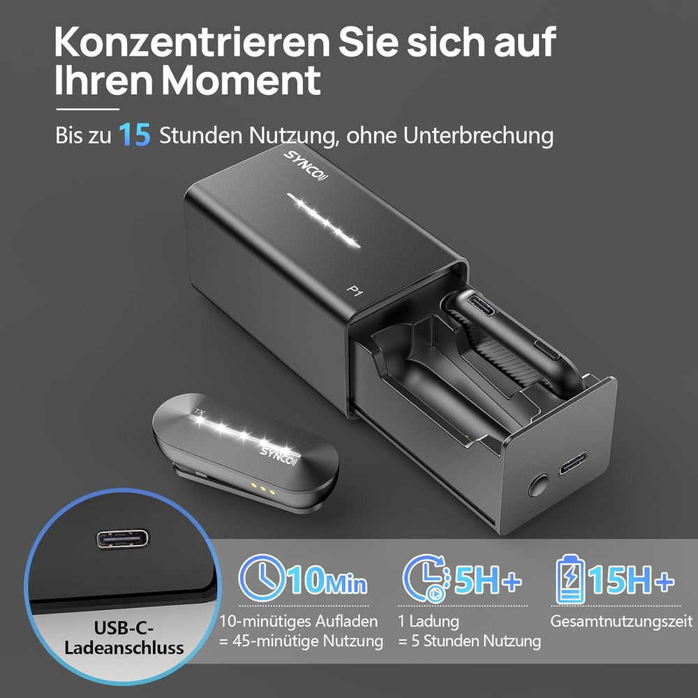 SYNCO Lavalier Mikrofon Kabellos【Type-C】, P1T 2.4GHz Smartphone Funkmikrofon Wireless mit Ladebox &