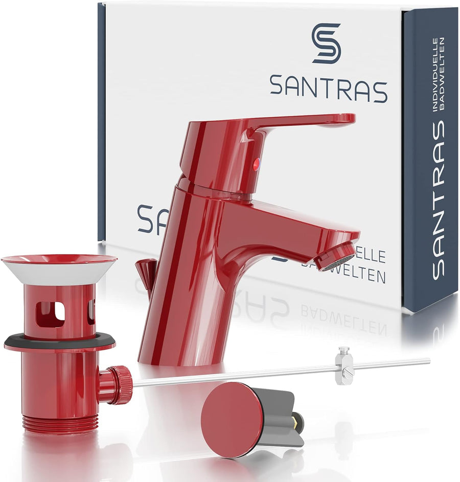 SANTRAS® Waschtischarmatur für das Bad mit Zugstange in Rot – Einhebel-Mischarmatur warm kalt für ei