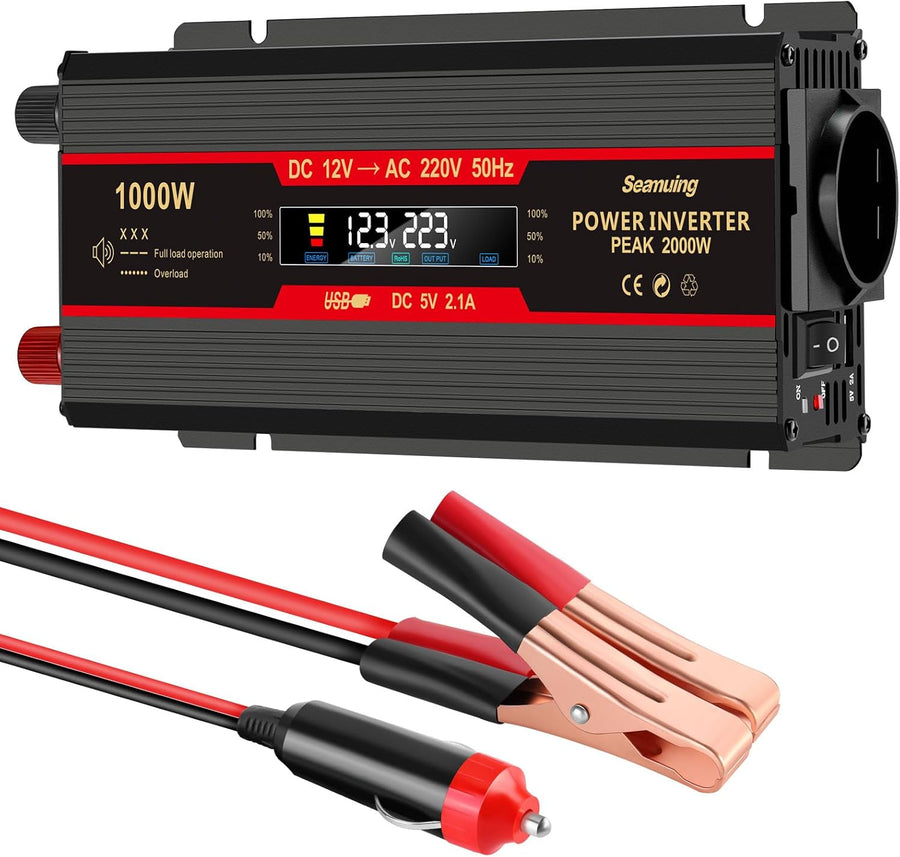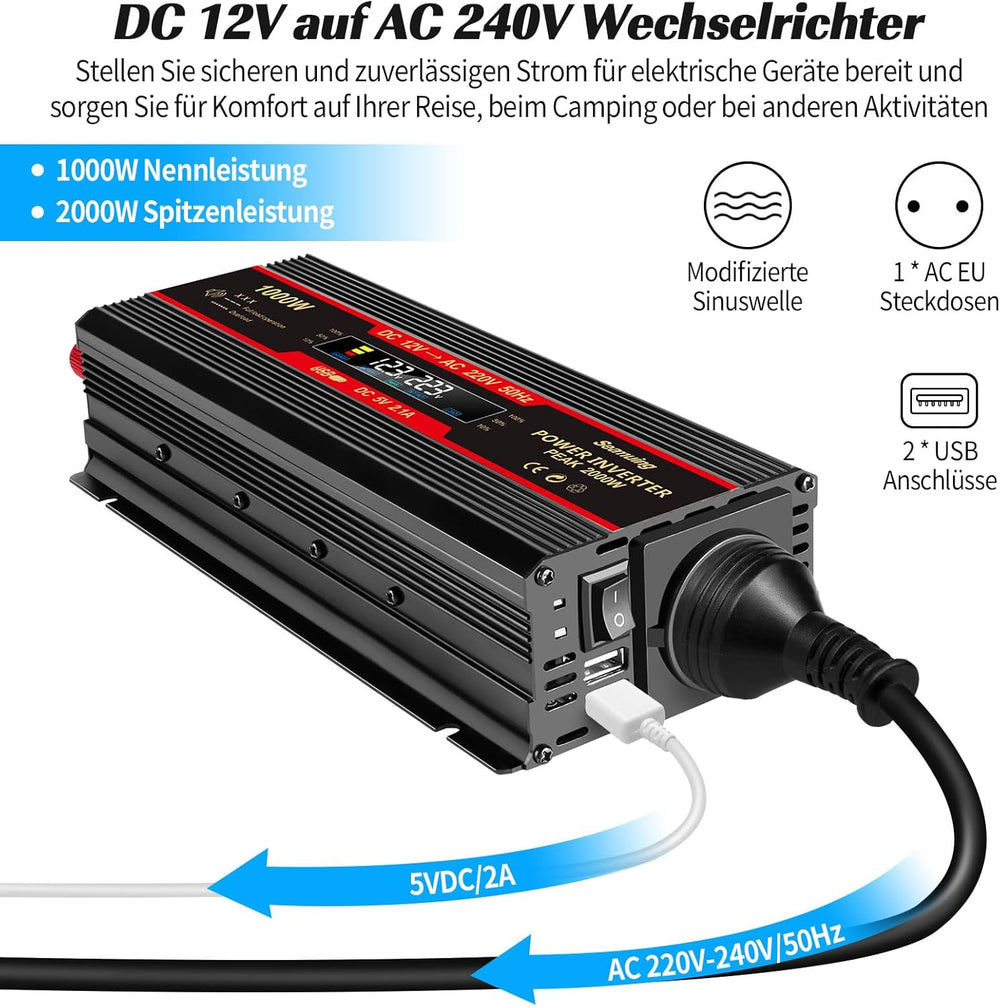 Seamuing 2000W Wechselrichter DC 12V auf AC 240V Spannungswandler 1 AC Steckdose & 2 USB Port Stromw