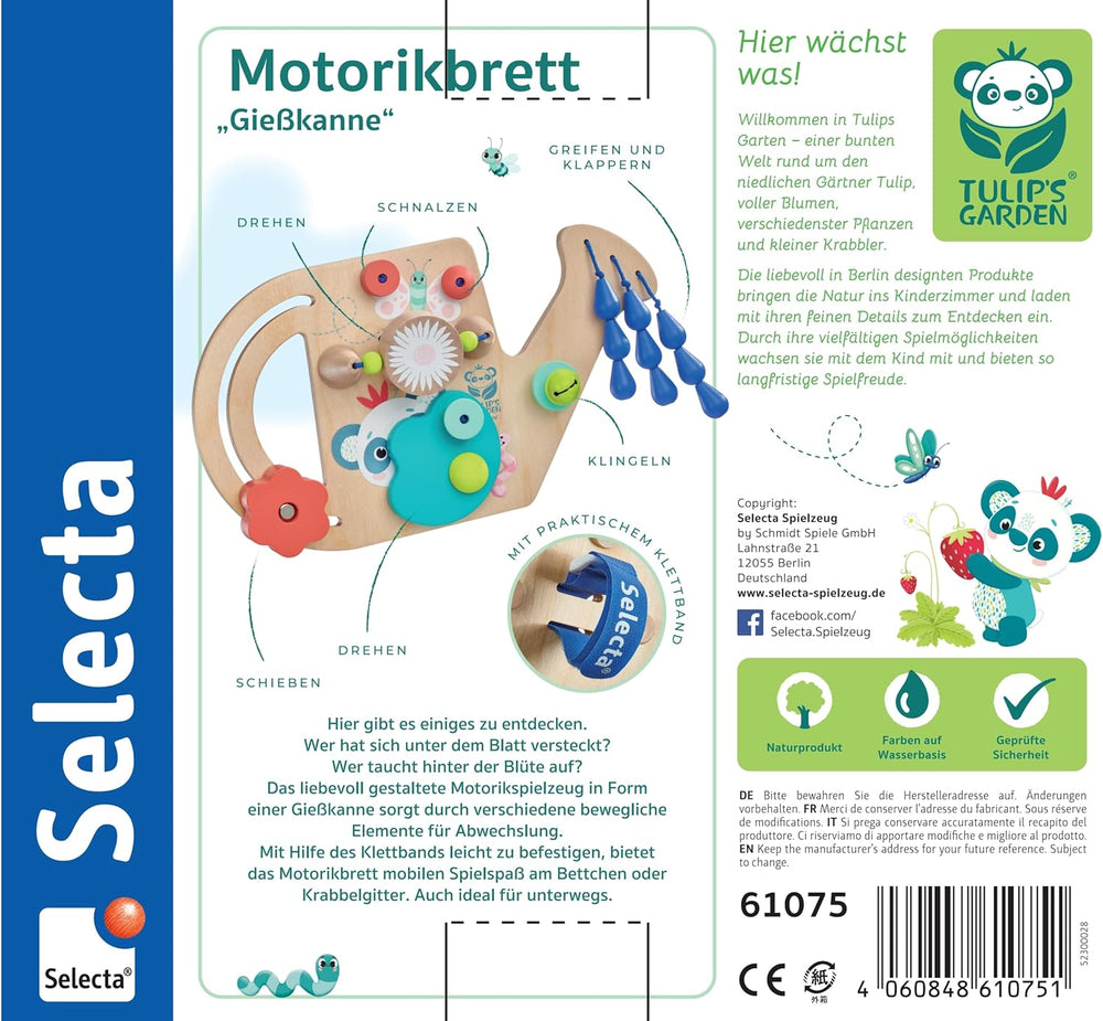Selecta 61075 Tulips Garden, Motorikbrett Giesskanne, 25 cm, Motorikspielzeug aus Holz