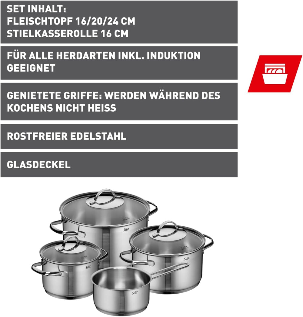 Silit Alicante Topfset Induktion 4-teilig, Kochtopf Set mit Glasdeckel, Edelstahl poliert, Induktion
