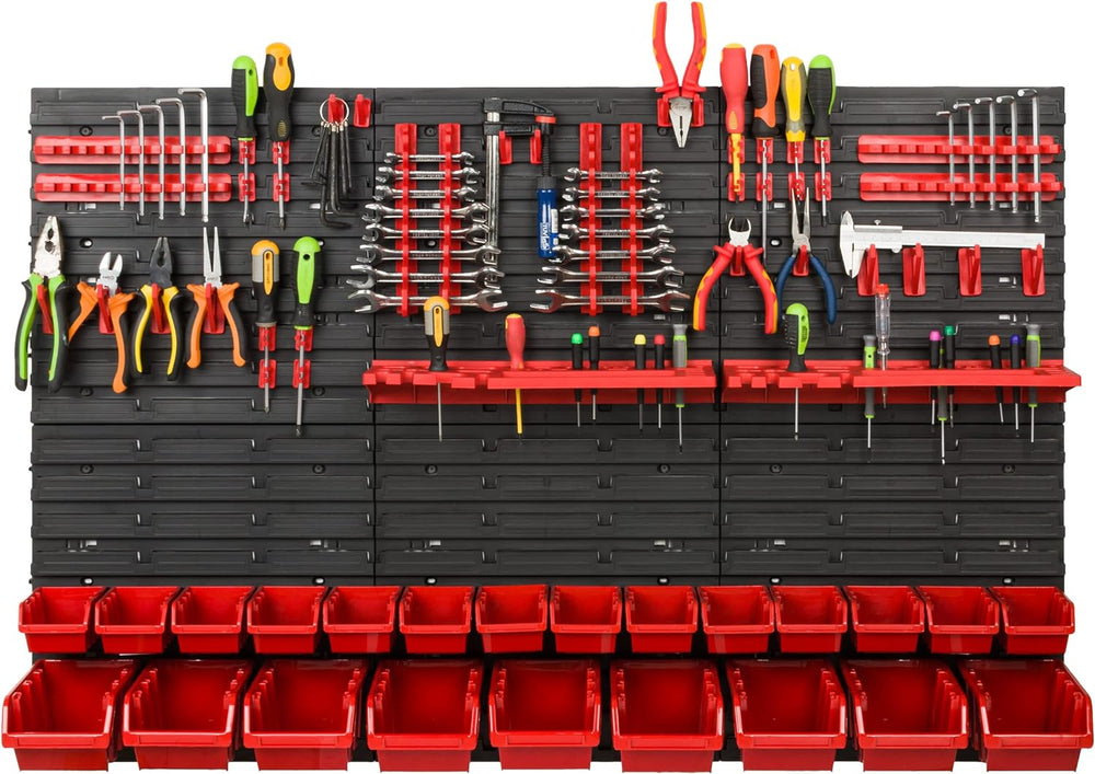Lagersystem Werkstattregal | 117 x 78 cm | 28 stck. Box | Wandregal mit Werkzeughalterungen und Stap