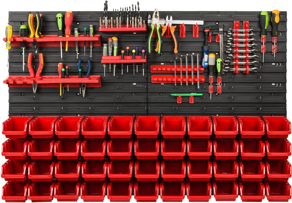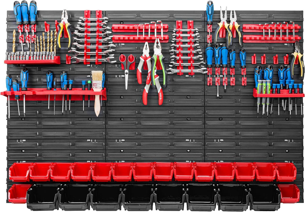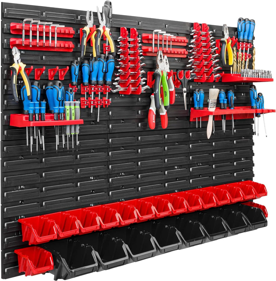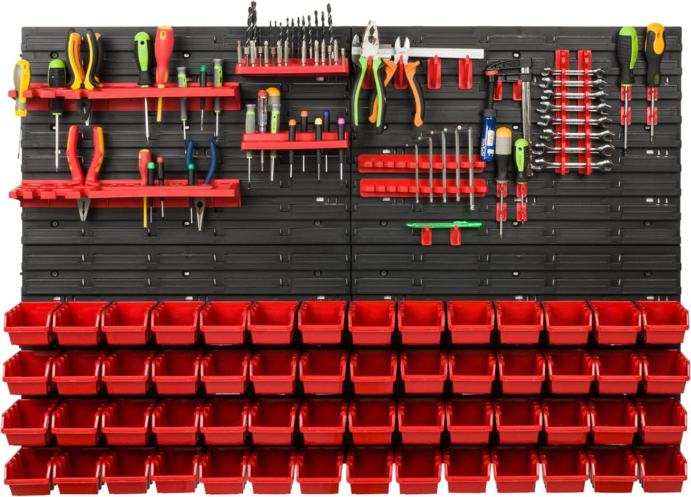 Lagersystem Werkstattregal | 115 x 78 cm | 56 stck. Box | Wandregal mit Werkzeughalterungen und Stap