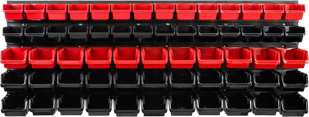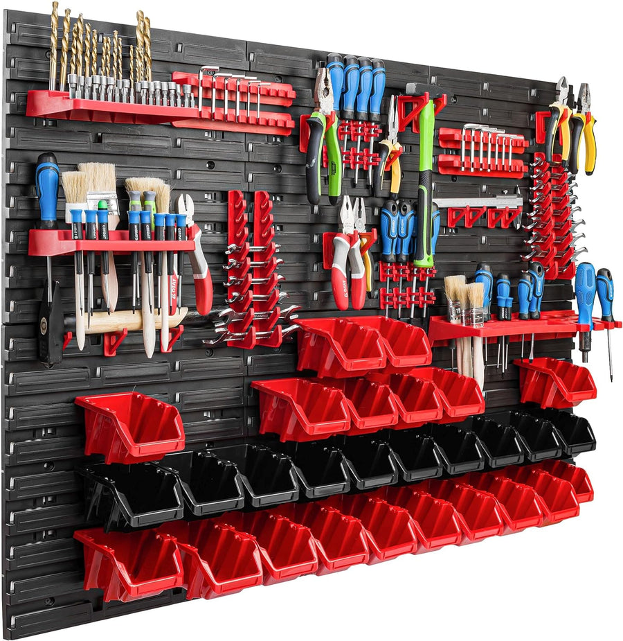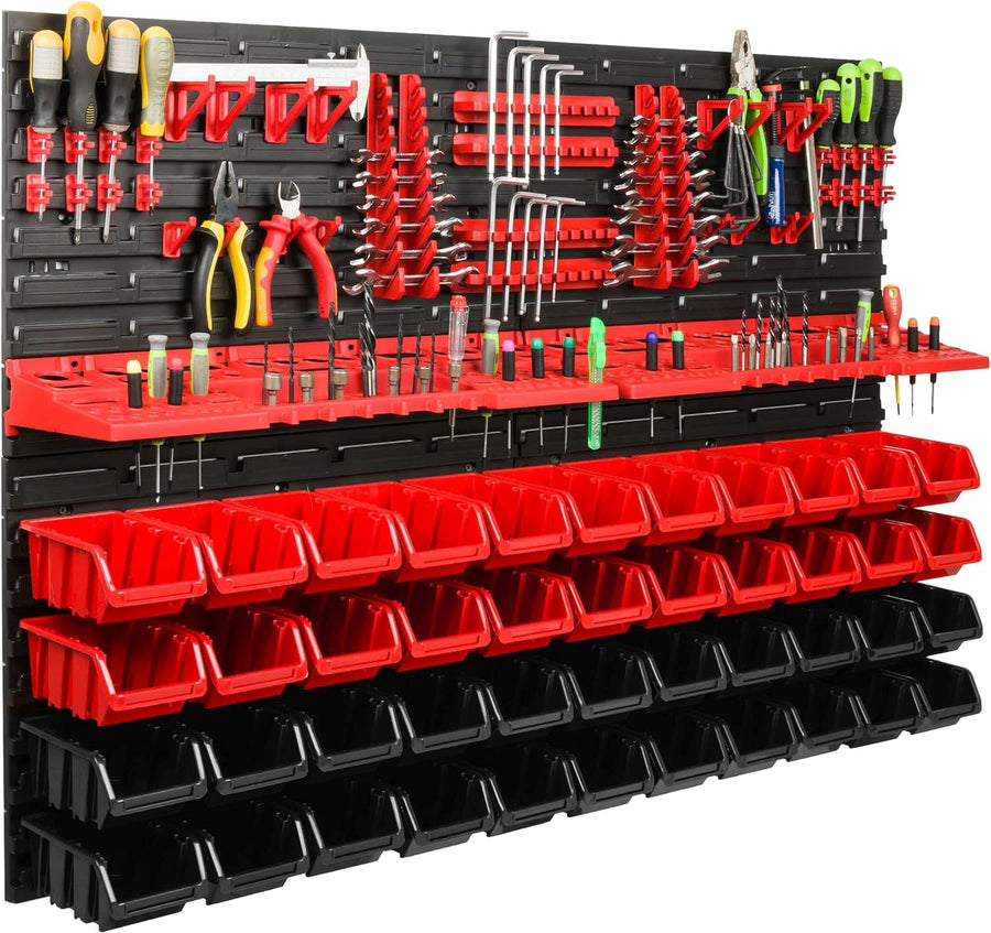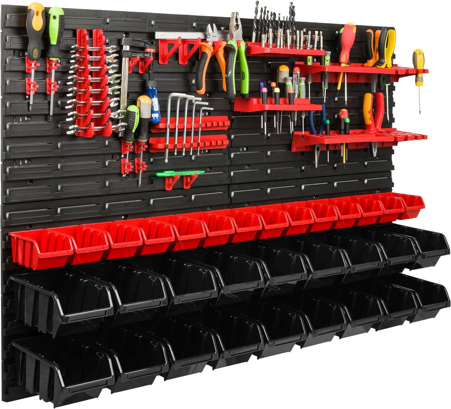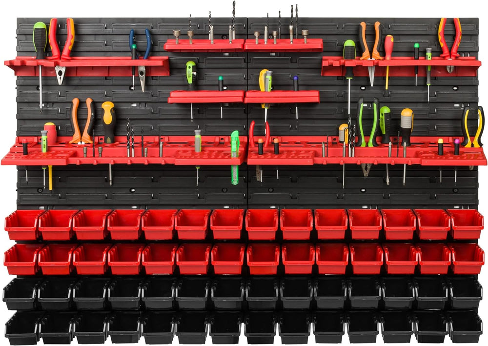 Lagersystem Werkstattregal | 115 x 78 cm | 56 stck. Box | Wandregal mit Werkzeughalterungen und Stap