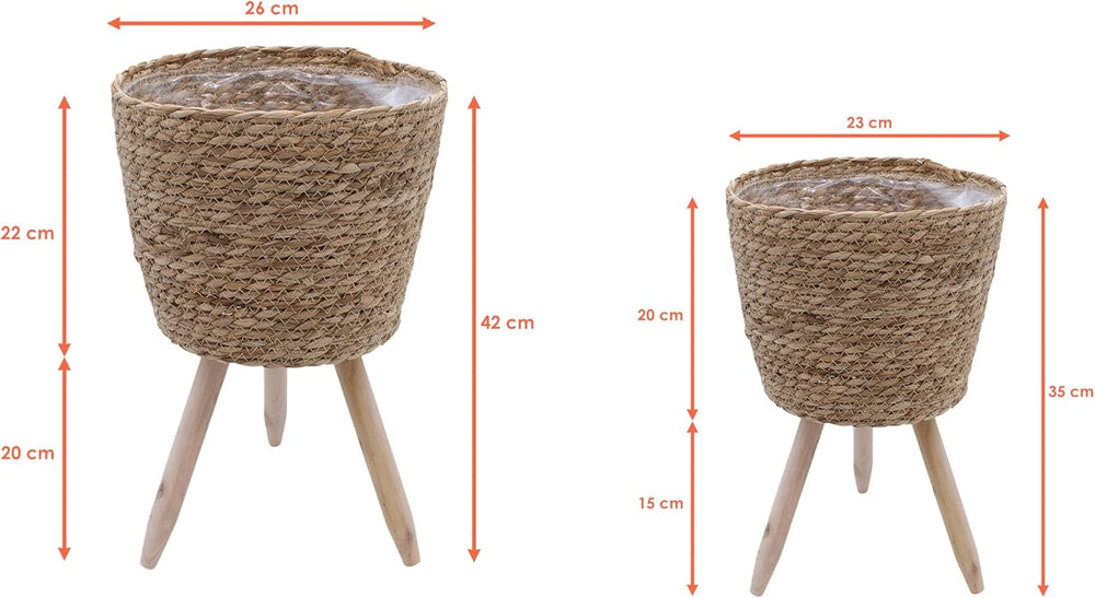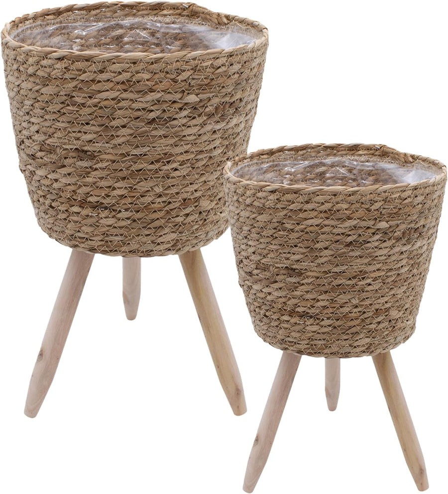Blumenständer aus Stroh innen mit Folie 2er Set - Ø 26 und 20 cm - Rattan Pflanzenständer mit 3 Holz