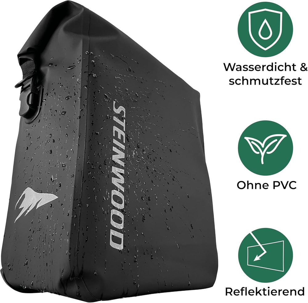 Steinwood Premium Fahrradtasche für Gepäckträger 20 L, wasserdichte Rolltop Umhängetasche, Zubehör T