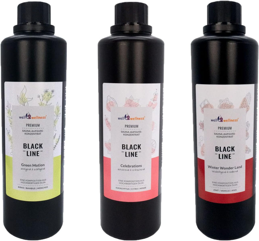 Black Line Saunaaufguss Saunaduft Geschenkset 3 x 500 ml mit Green Motion, Winter Wonderland, Celebr