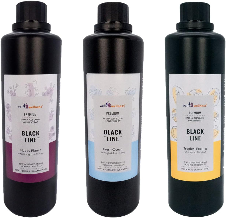 Black Line Saunaaufguss Saunaduft Geschenkset 3 x 500 ml mit Happy Planet, Tropical Feeling und Fres