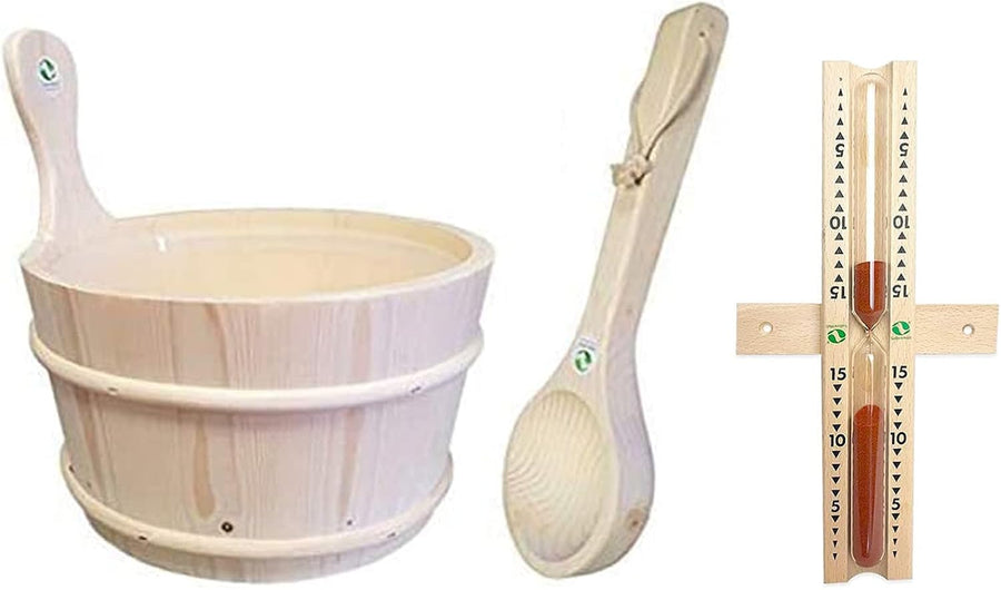 SudoreWell® Saunakübel Saunaeimer aus Espe 4,0 ltr. mit Einsatz + Saunakelle Plus Sanduhr Exklusiv 1