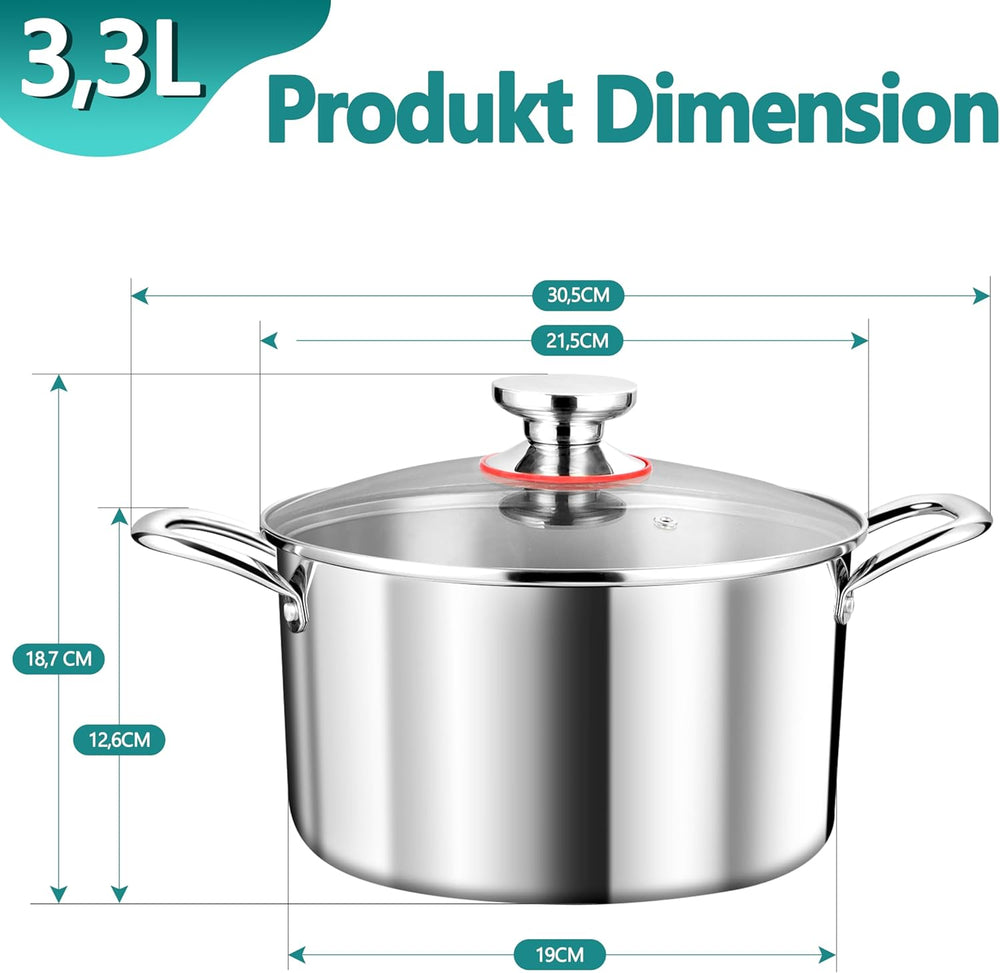 TEAMFAR Kochtopf, 20cm Topf Induktion aus 3-Lagen Edeastahl, 3,3L Nudeltopf Fleischtopf mit Glasdeck