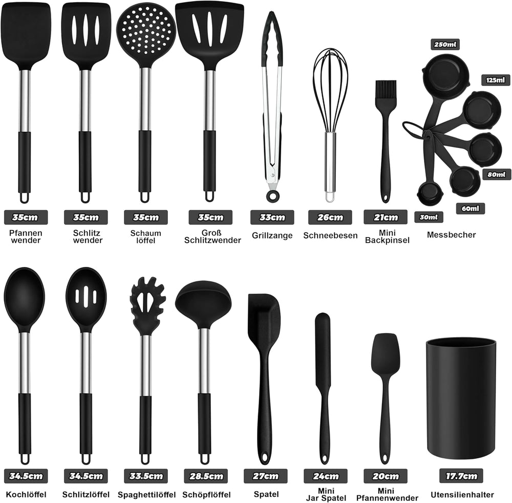 TEAMFAR Küchenhelfer, 20 Stück Silikon Schwarz Kochbesteck Kochutensilien Set mit Edelstahlgriff, Hi