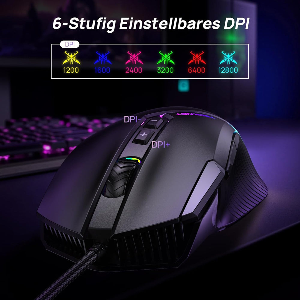 TECKNET Kabelgebundene Gaming Maus, Treibereinstellung 6 Stufen (12800-1200) DPI Mouse mit optischem