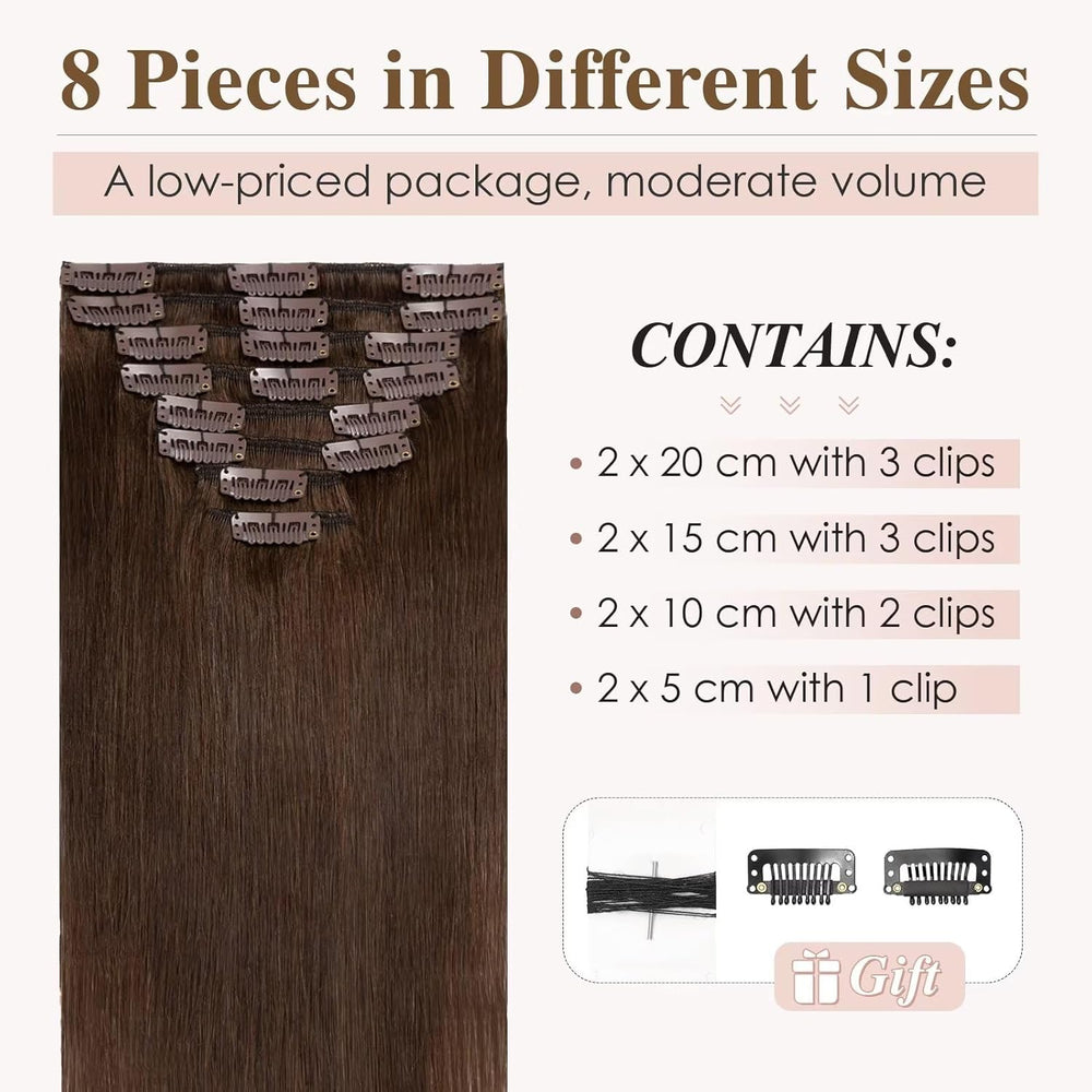 TESS 50 cm Clip in Extensions Echthaar Dunkelbraun 8 PCS Hair Extensions Clip in Echthaar 70g Braun