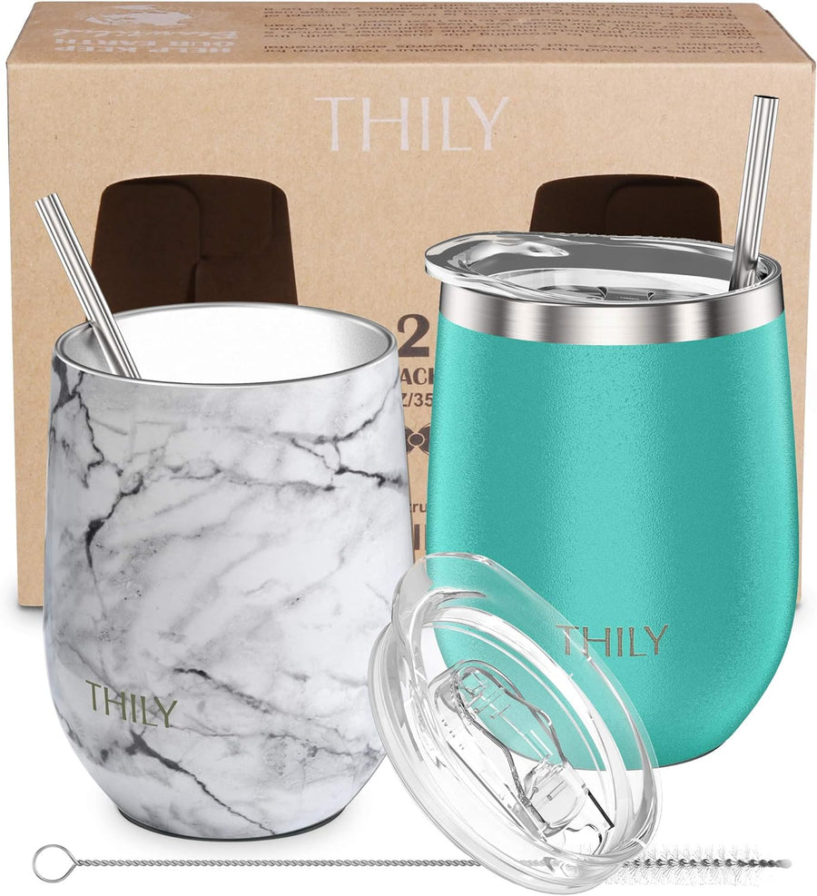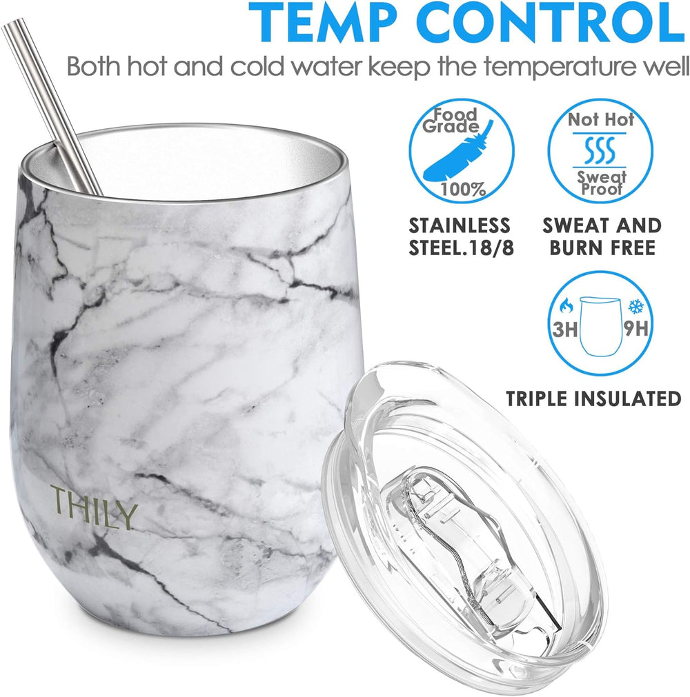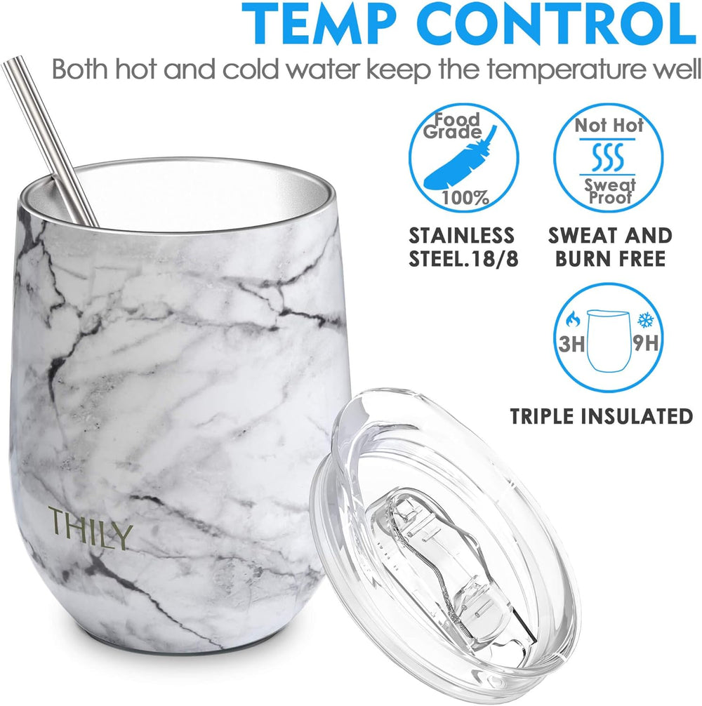 THILY Weingläser ohne Stiel aus Edelstahl, vakuumisoliert, mit Deckel und Strohhalm, wiederverwendba