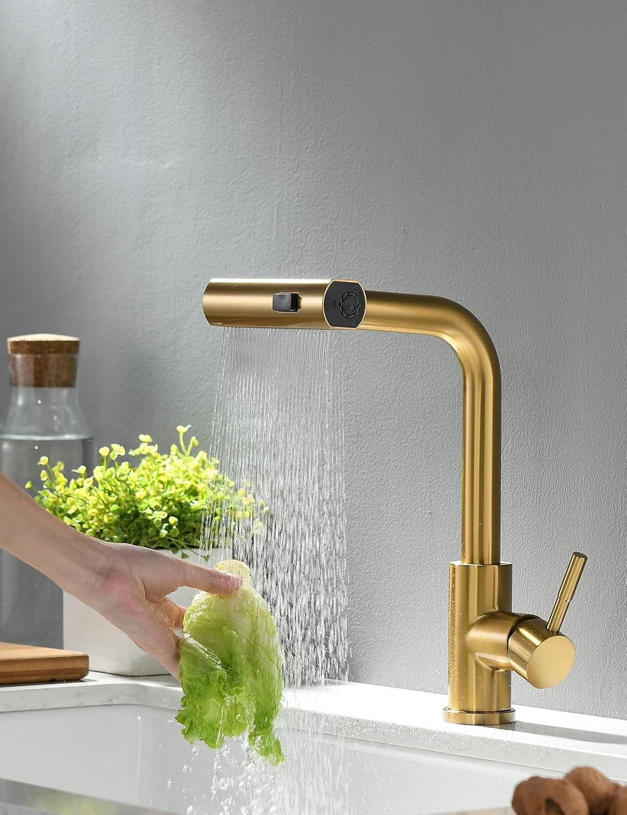 TIMACO Gebürstetes Gold Küchenarmatur mit 360° Drehbar, mit Pull-Down-Sprühgerät Armatur Mischbatter