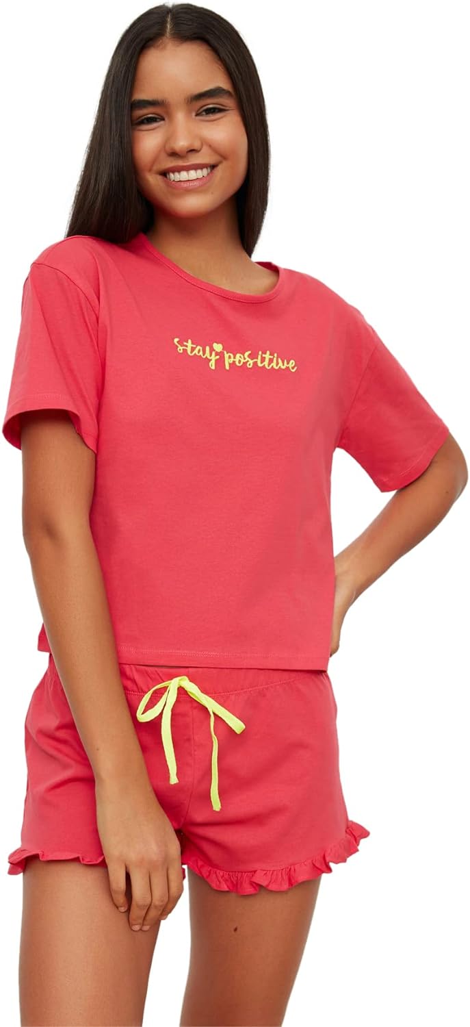 Trendyol Damen Fuchsia Embroidered Knitted Kit Pajama Set, Fuchsia, XL EU