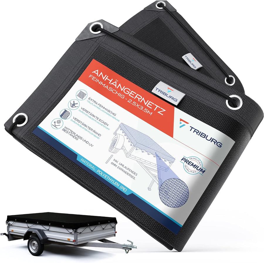 TRIBURG Anhängernetz 2,5x3,5 inkl. 10x Expander Haken - Anhänger Netz mit Eckmarkierungen und Randve