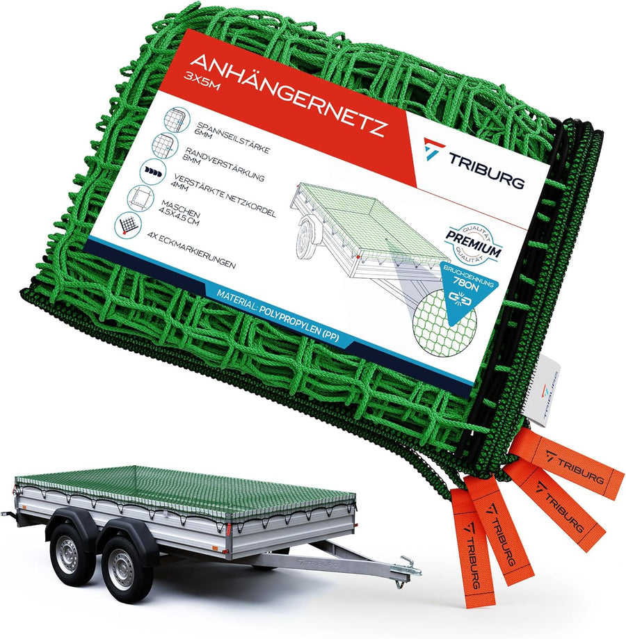 TRIBURG Anhängernetz 3,5x5 inkl. 12x Expander Haken - Anhänger Netz mit Eckmarkierungen und Randvers