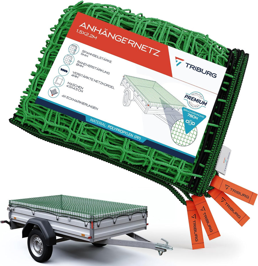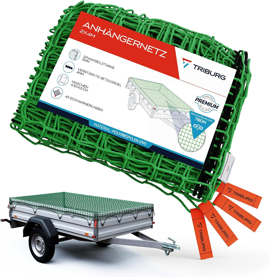 TRIBURG Anhängernetz 2x4,5 inkl. 10x Expander Haken - Anhänger Netz mit Eckmarkierungen und Randvers