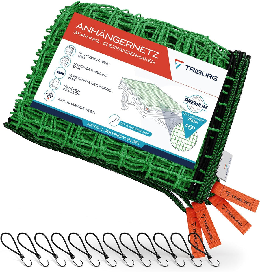 TRIBURG Anhängernetz 3x4 inkl. 12x Expander Haken - Anhänger Netz mit Eckmarkierungen und Randverstä