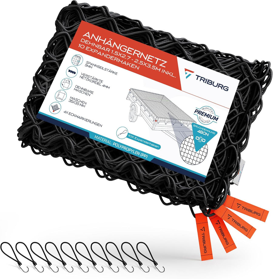 TRIBURG Anhängernetz Dehnbar 2x3 m bis 3x4 m inkl. 12 Expanderhaken | Elastisches Anhänger Netz mit