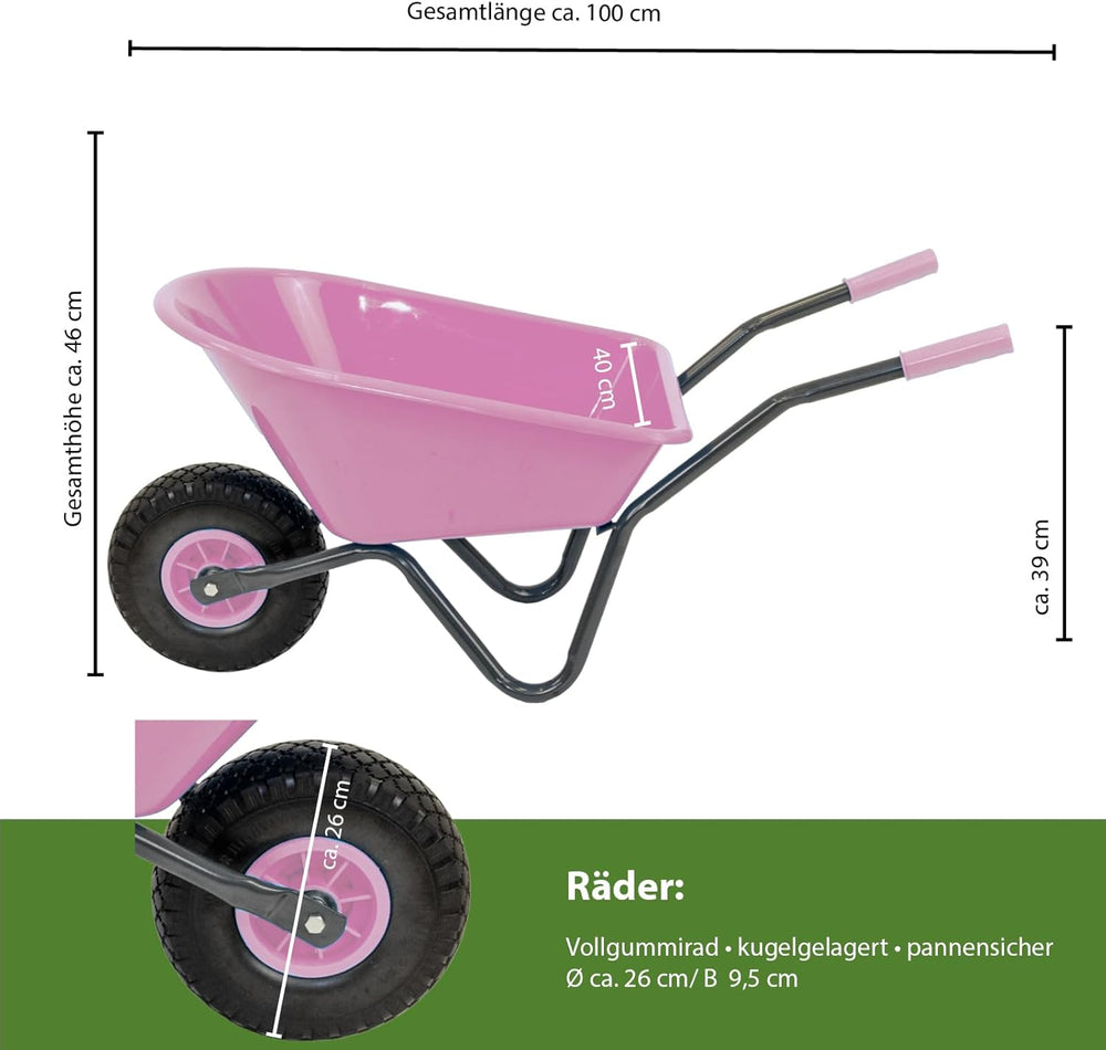 Kinderschubkarre Uni 40 kg Traglast 3,6 kg Stahl Kunststoff rosa Vollgummirad Schiebkarre Garten Uni