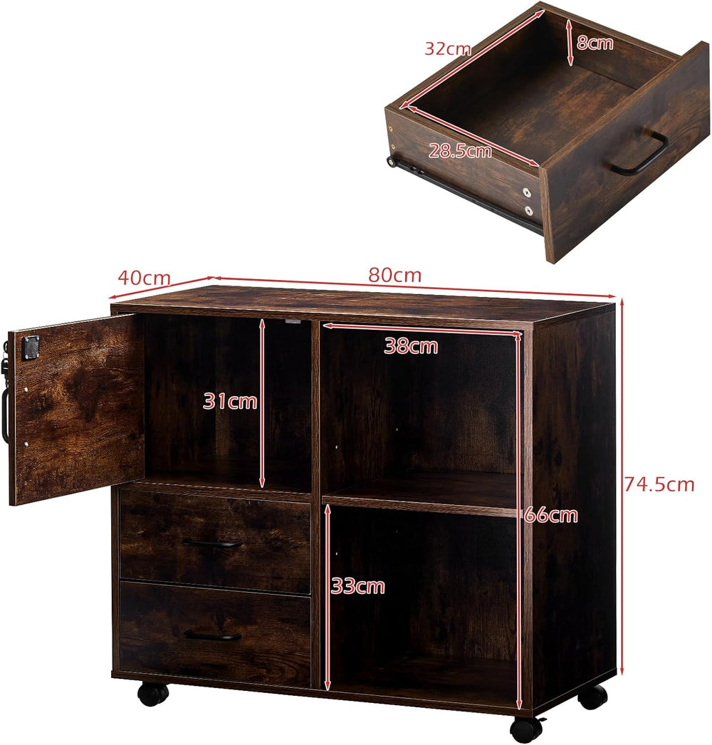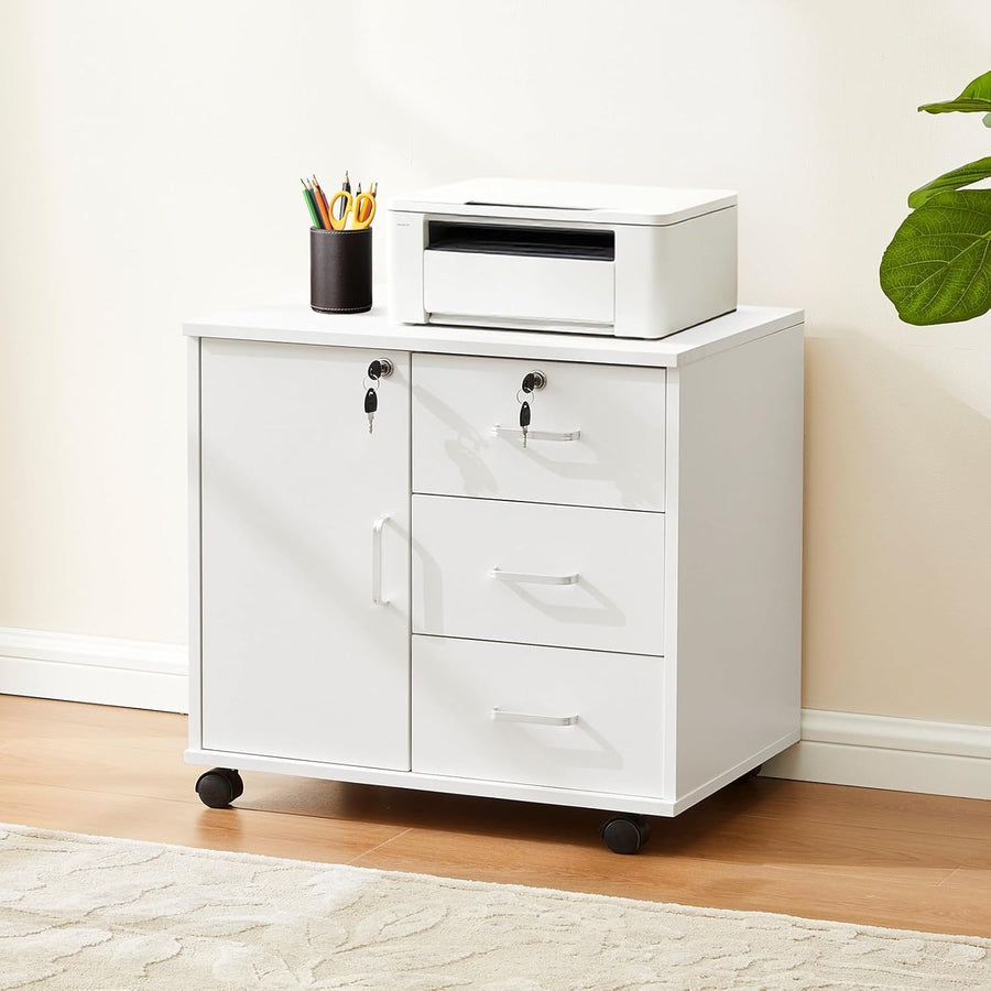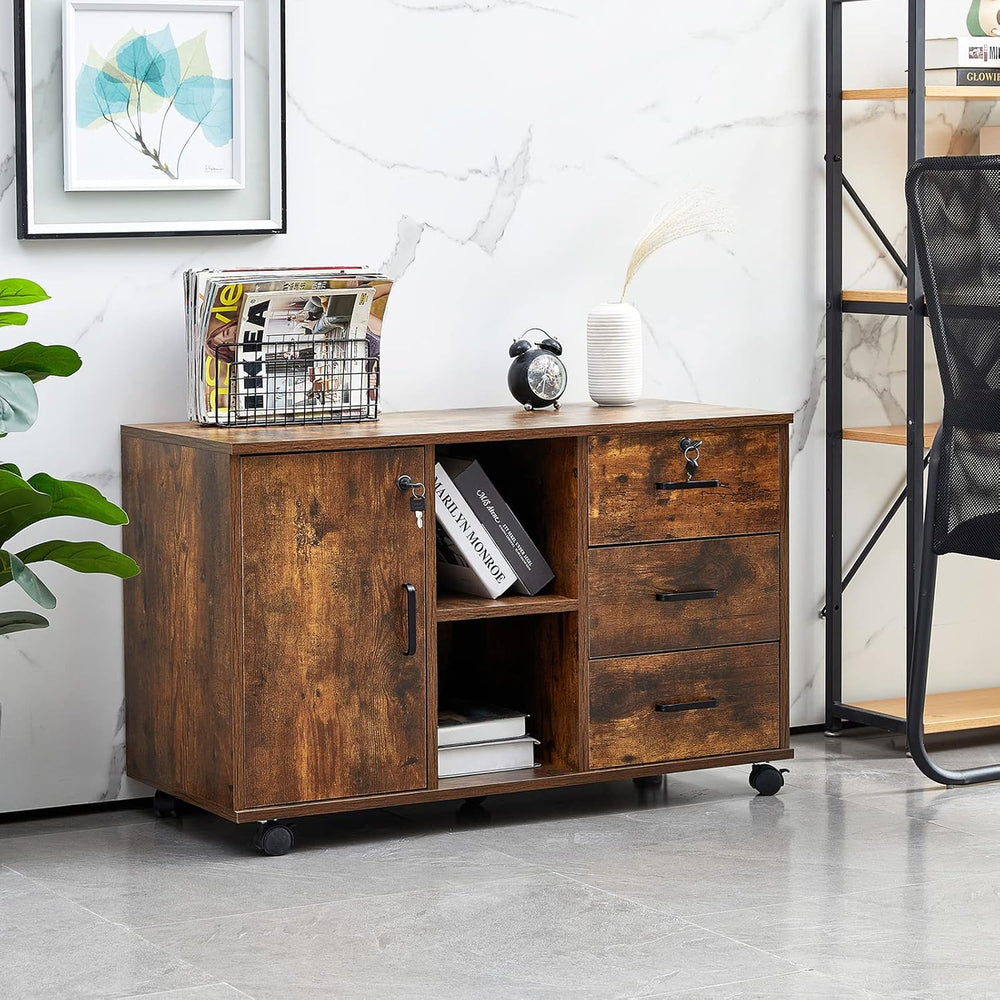 TUKAILAI Rollcontainer Aktenschrank aus Holz, Abschliessbar Büroschrank mit 3 Schubladen und Tür, Mo