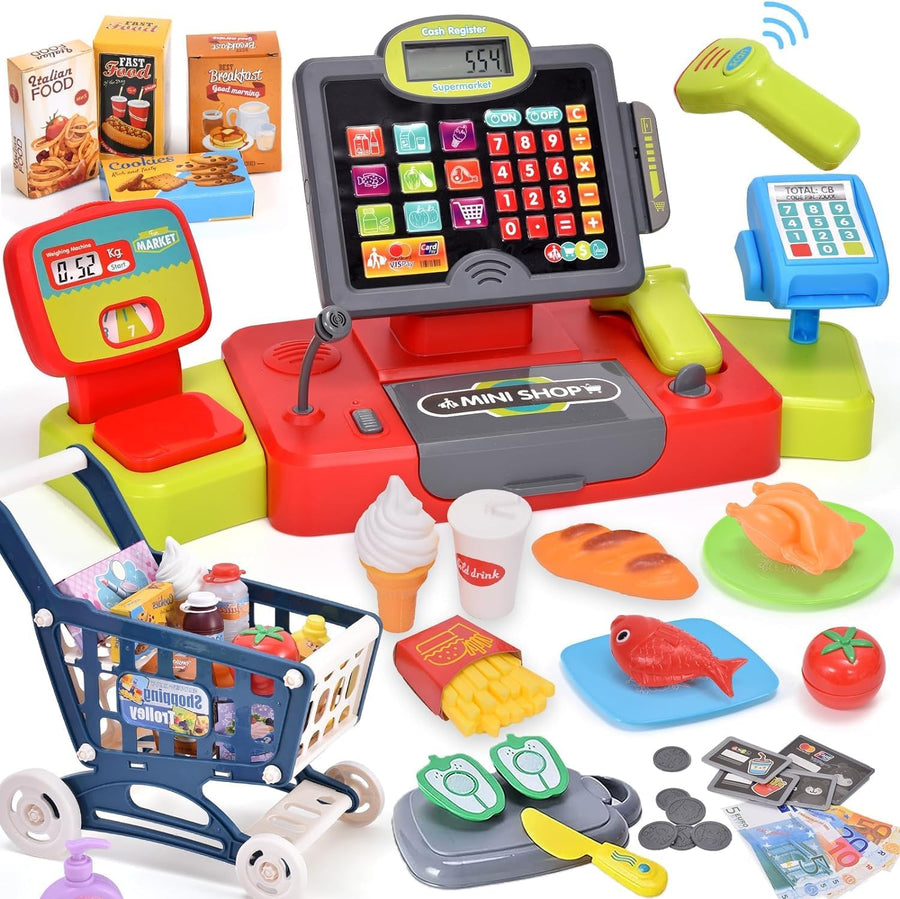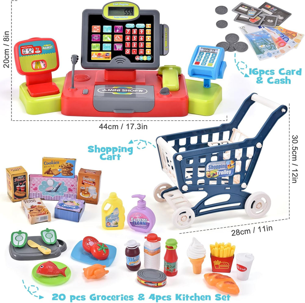 Kinderkasse Spielzeug Elektronisch Kasse Kaufladen Kinder mit Scanner, Einkaufswagen, Rechnerfunktio