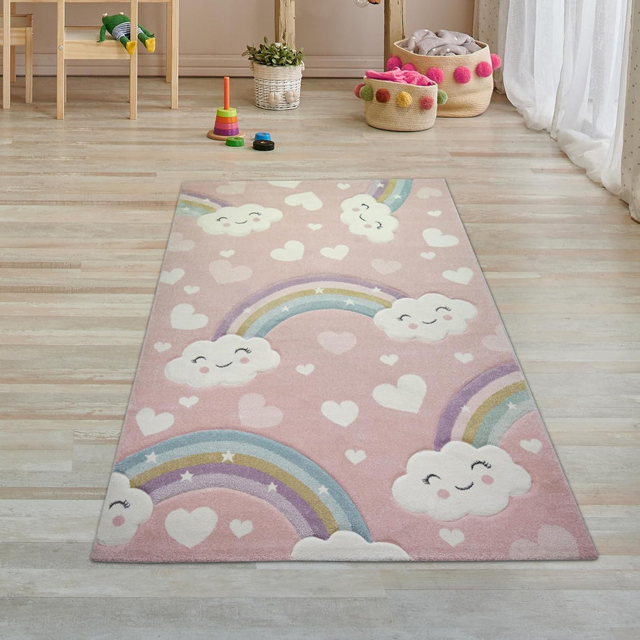 Teppich-Traum Kinderteppich Kinderzimmerteppich Regenbogen mit Wolken und Herzen in rosa Grösse 80x1