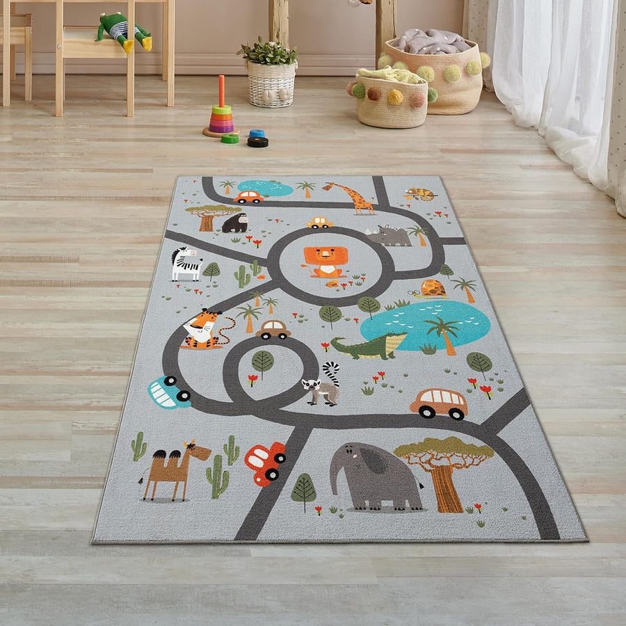 Teppich-Traum Kinderteppich Kinderzimmer Teppich waschbar rutschfest Spielteppich Safari Strassen Au