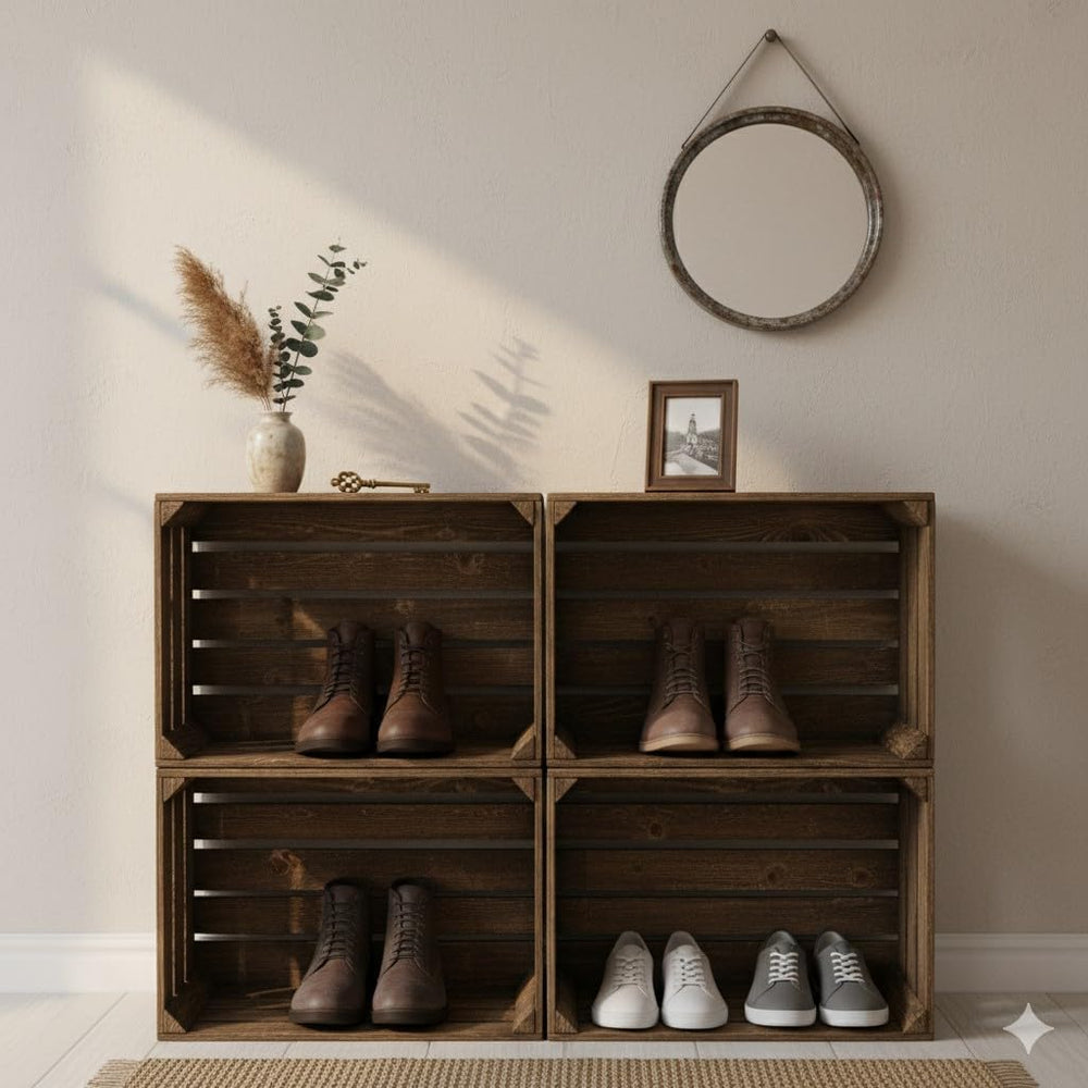 Massive Holzkisten als Schuhregal Bücherregal GEFLAMMT Zwischenbrett Apfelkisten Obstkisten Weinkist