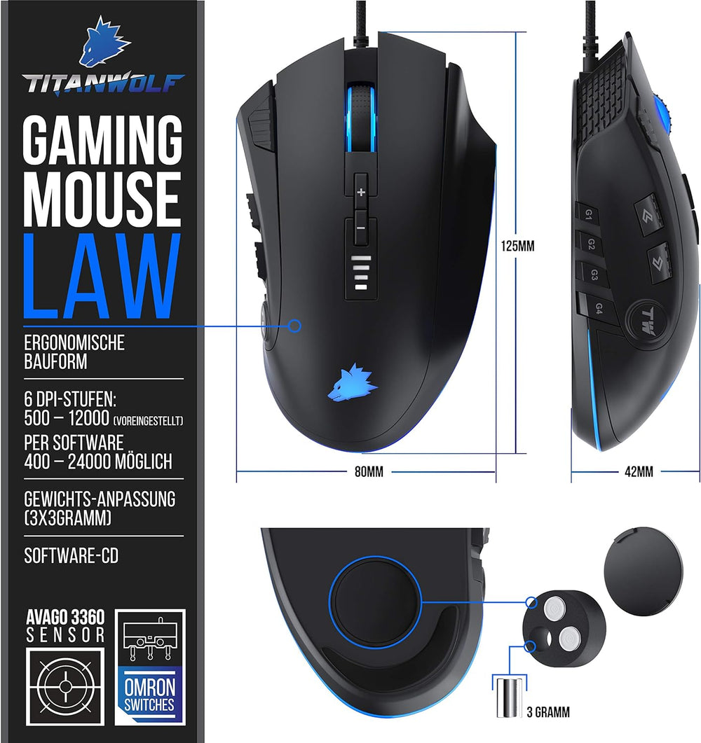 Titanwolf - Gaming Maus - Mouse mit 24.000 DPI Abtastrate - Sensor Avago 3360-12 Tasten - inkl. Soft