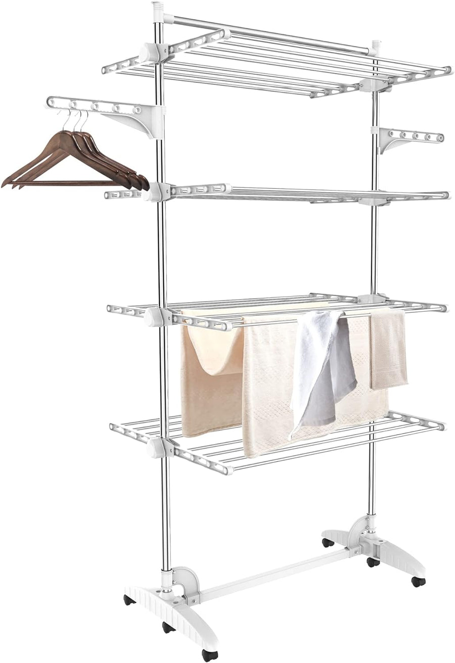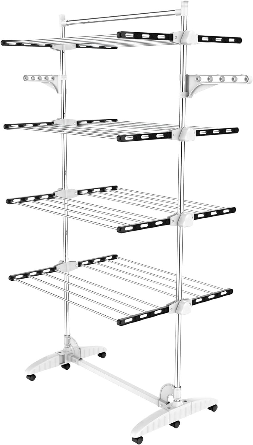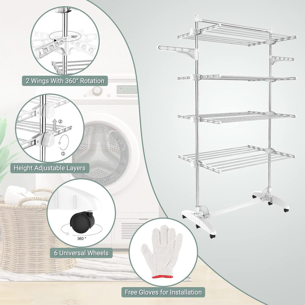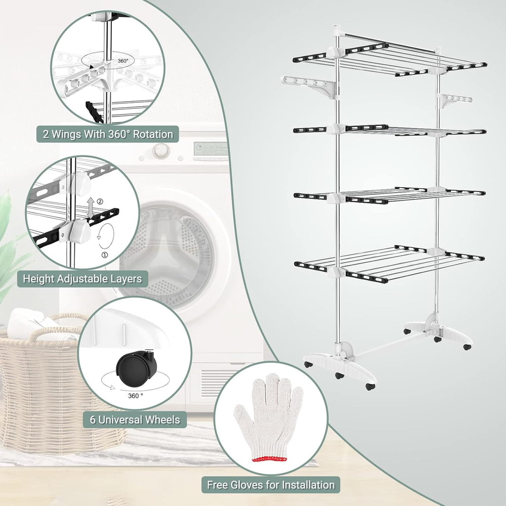 Todeco Wäscheständer Turm Klappbar, Wäscheturm 4 Ebenen aus Edelstahlrohre, Turmtrockner mit 6X Roll