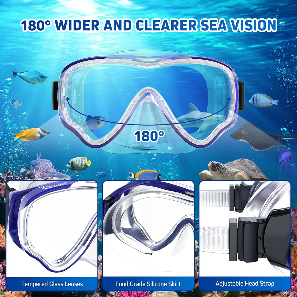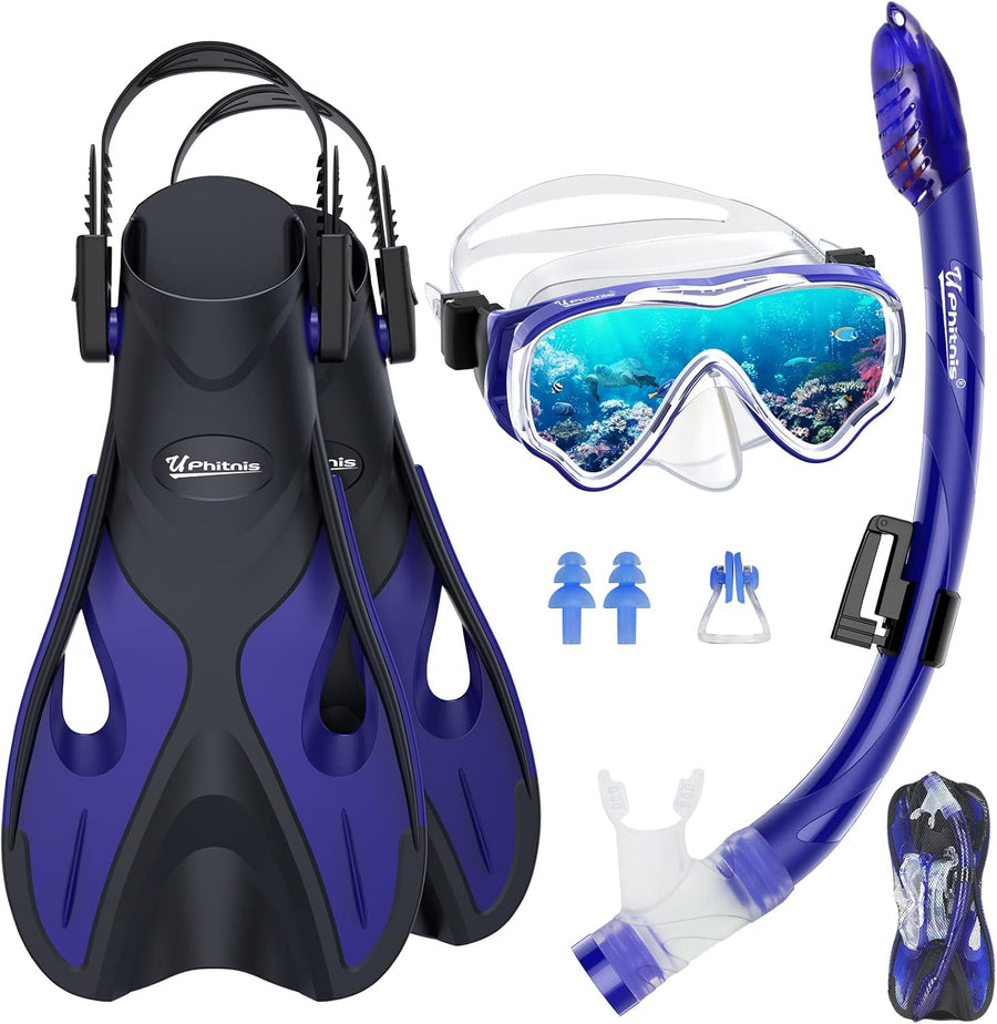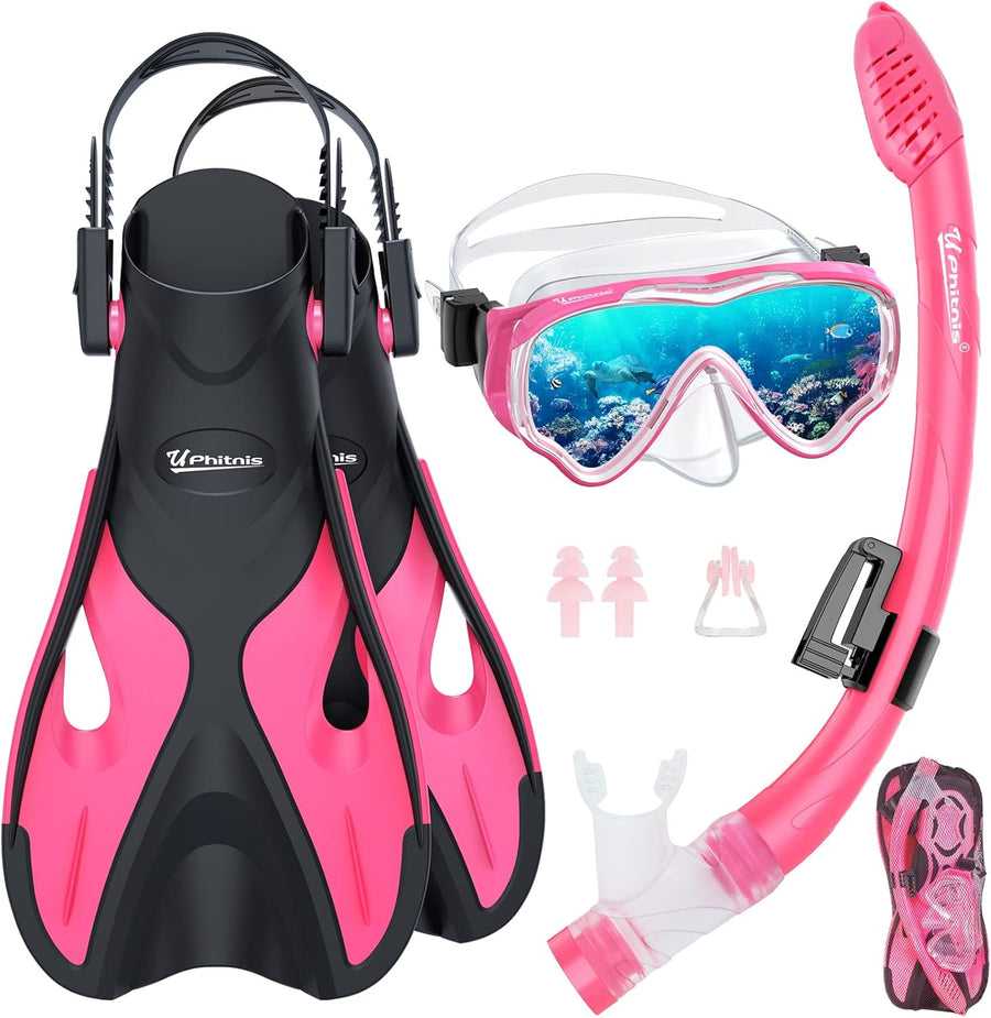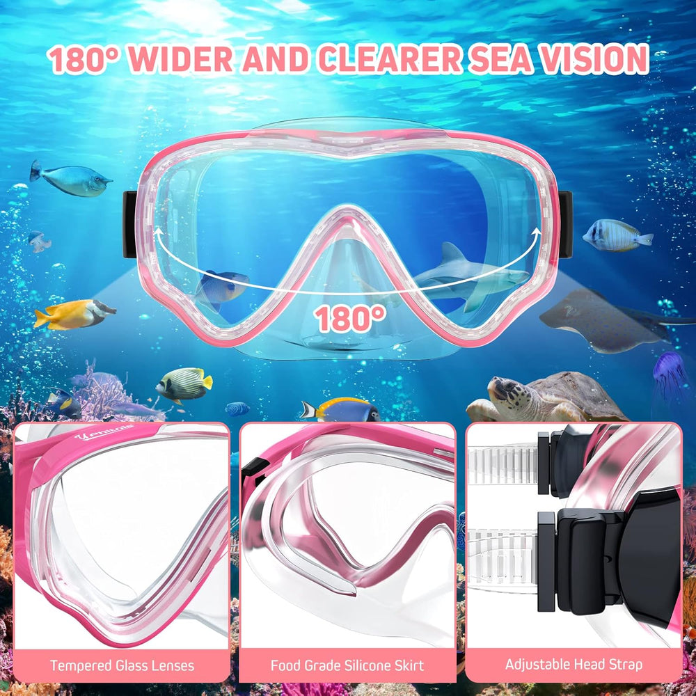 UPhitnis Schnorchelset Kinder mit Flossen,Anti-Fog 180°Panorama Taucherbrille Kinder, Verstellbaren